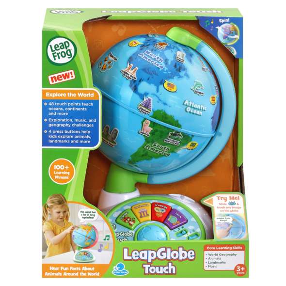 Spin the globe and see the lights as you learn! 48 touch sensitive landmarks and graphics teach about interesting places across the globe. There are 3 modes of play where you can explore the globe, hear world music and play a fun quiz finding various landmarks or animals based on descriptions. Press the four different category buttons to hear fun learning songs about greetings, animals, countries and continents.