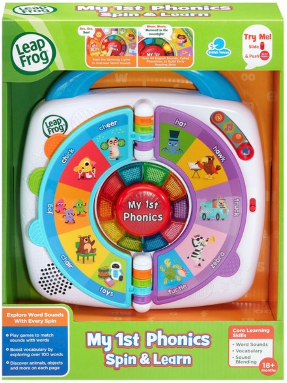 Introducing Leapfrog My 1st Phonics: Spin and Learn – a captivating educational tool designed to make early phonics a delightful adventure! With 10 light-up buttons, your little one can press to dive into the world of letter sounds, supported by 5 double-sided pages featuring engaging images that bring phonics to life. Explore the richness of the English language with 107 vocabulary words, highlighting the 44 sounds that form the foundation of reading and pronunciation. For a random and exciting letter sound learning experience, just press the red button, or opt for a more focused approach by selecting one of the 10 light-up buttons. Dive into a world of modes – Explore, Fun Sounds, Sound Detective, and Sound Blender – each offering a unique and entertaining way to absorb phonics knowledge. Plus, with the convenience of a carry handle, learning is not confined to one space. Take My 1st Phonics on the go for continuous learning adventures. Make early phonics an engaging journey with Leapfrog My 1st Phonics: Spin and Learn, where every spin brings a new wave of learning and exploration!
