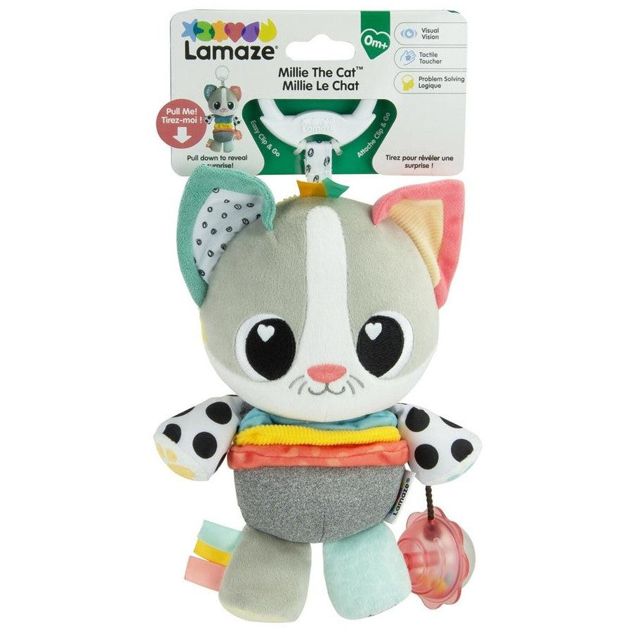 Give baby a purr-fect playmate! Lamaze's Millie the Cat developmental toy makes a great first pet for baby. Show baby how pulling on her feet helps her stretch out, then let go and listen to her entertaining chattering noise as she crunches back down to her normal size. Millie carries a fun “yarn” ball rattle that also makes intriguing sounds and is another nice way to introduce baby to the concept of cause and effect. This soft and cuddly kitten features bright colors and contrasting patterns that help stimulate baby's visual perception. Your baby will also love discovering her crinkly ears and satin ribbons. Millie includes a multi-purpose clip, designed to attach easily to strollers or diaper bags so she can travel with baby wherever the day takes you.