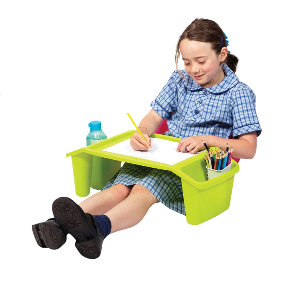 The Student Lap Desk is made from sturdy, high-quality plastic, making them durable and easy to clean. This versatile Lap Desk will quickly become the perfect work surface when conventional desk space is unavailable or sitting outside in the sunshine is an option. The Student Lap Desk conveniently stack for quick and easy storage. Includes cup/bottle holder