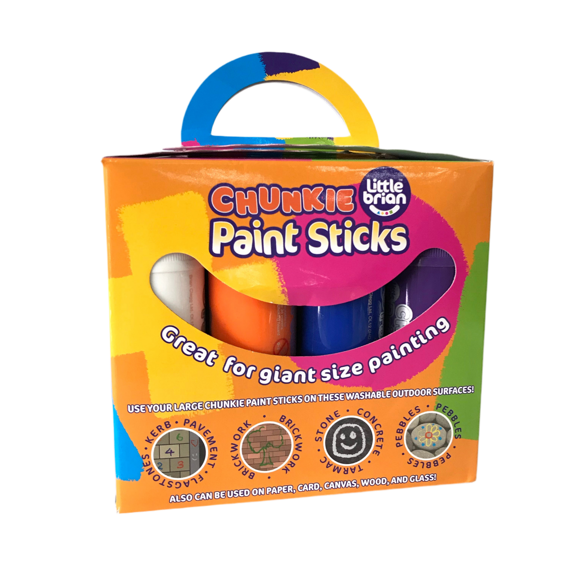 Little Brian Chunkie Paint Sticks are a mess free way of painting giant size paintings and outdoor painting. These easy grip sticks are perfect for little hands. The 40 g paint sticks have been developed for larger painting activities and perfect for painting on outdoor surfaces such as concrete, stone, flags and pavement. Easily washes off outdoor surfaces with water. Suitable for 3 years and over kids. Comes in a pack of 12 pieces.