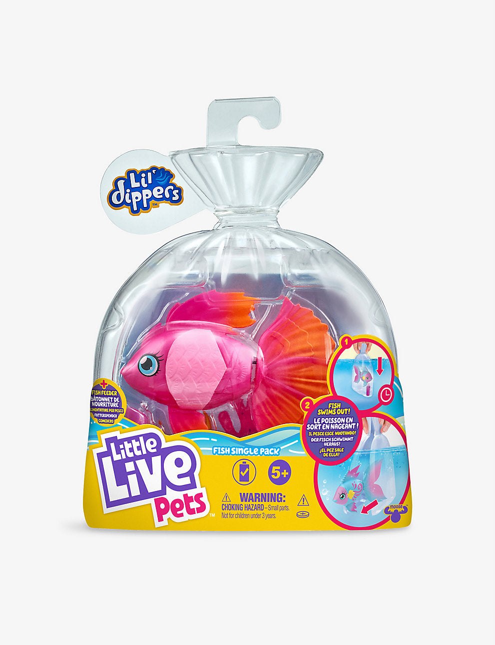 Hold the bag under water and as the bag fills, Lil' Dippers will magically come to life and swim out of the bag! Use their magical feeding tool and watch as they swim and follow along for a delish fish treat.