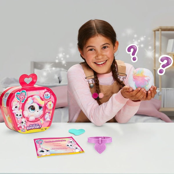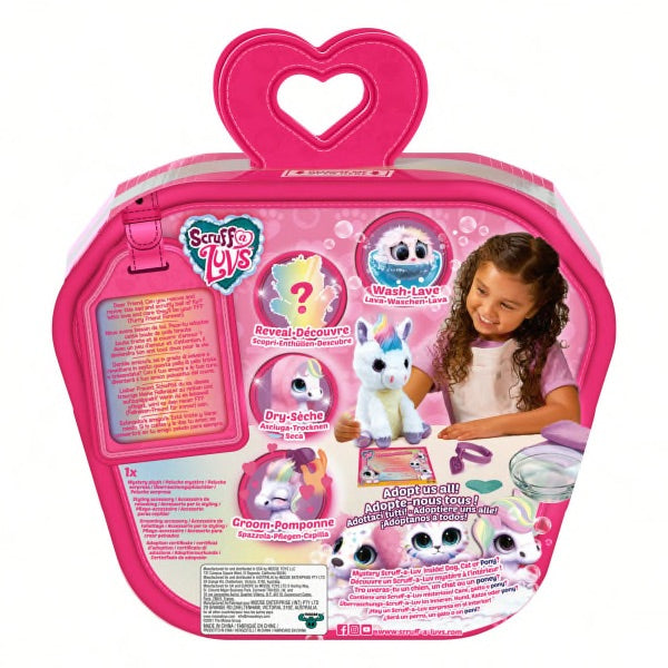 Inside the box is a mystery pet waiting to be rescued! Which Scruff-a-Luvs will you rescue? Will you find a Scruff-a-Luvs Dog, Cat or Pony inside? Your Scruff-a-Luvs pet arrives as a sad ball of matted fur, but once you bathe them to reveal their true pastel rainbow fur, dry, brush and love them, you will discover what kind of pet they really are! Discover their beautiful pastel rainbow colours! Every Scruff-a-Luvs comes with their very own beautiful comb for you to give your new pet a grooming session to make them look extra special. These Scruffs all have new 'soft-touch' fur making them even extra cuddly! Finally, place their collar and tag around their neck to give them a 'pawfect' look! Plus your Scruff-a-Luvs comes with an adoption certificate for you to fill in. Give Your Scruff-a-Luvs a loving home and make them your own! With love and care, they'll be your FFF (Furry Friend Forever).