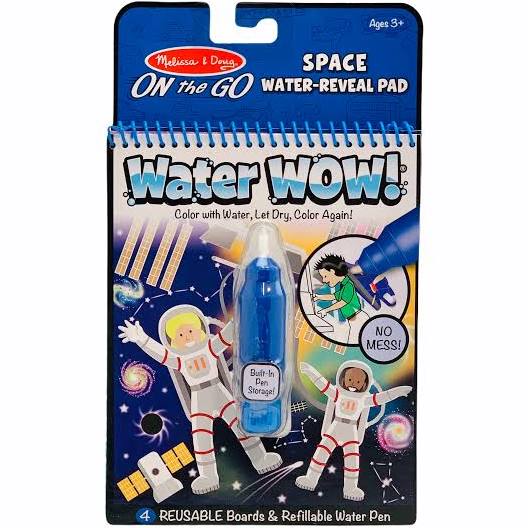 No-mess painting for kids! This exciting paint-with-water colouring book includes four reusable pages and a refillable water pen. Simply use the pen to colour in each scene--details and vibrant colour appear with every stroke! Then let the page dry to erase the pictures and colour it in again and again. This space-themed book includes four exciting scenes to colour (satellites, rocket ship, lunar landing, and space station), and a search-and-find activity for each scene. The chunky-sized water pen is easy for kids to hold and stores neatly right in the front cover, making this Water WOW! an ideal travel activity book and travel toy for kids!