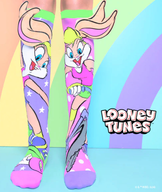Ride into action with our Lola Bunny Socks featuring plush 3D silk printed ears bringing this classic cartoon character to life! Glide on a bicycle with Lola on one sock, and kickflip into fun with her on a skateboard on the other. Wrapped in a hug of pastel hues and twinkling stars, these socks are your ticket to nostalgic fun, wherever you go!