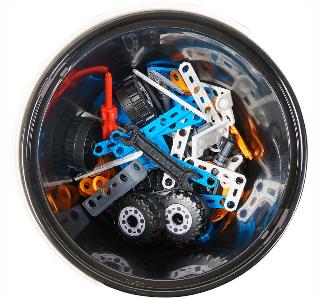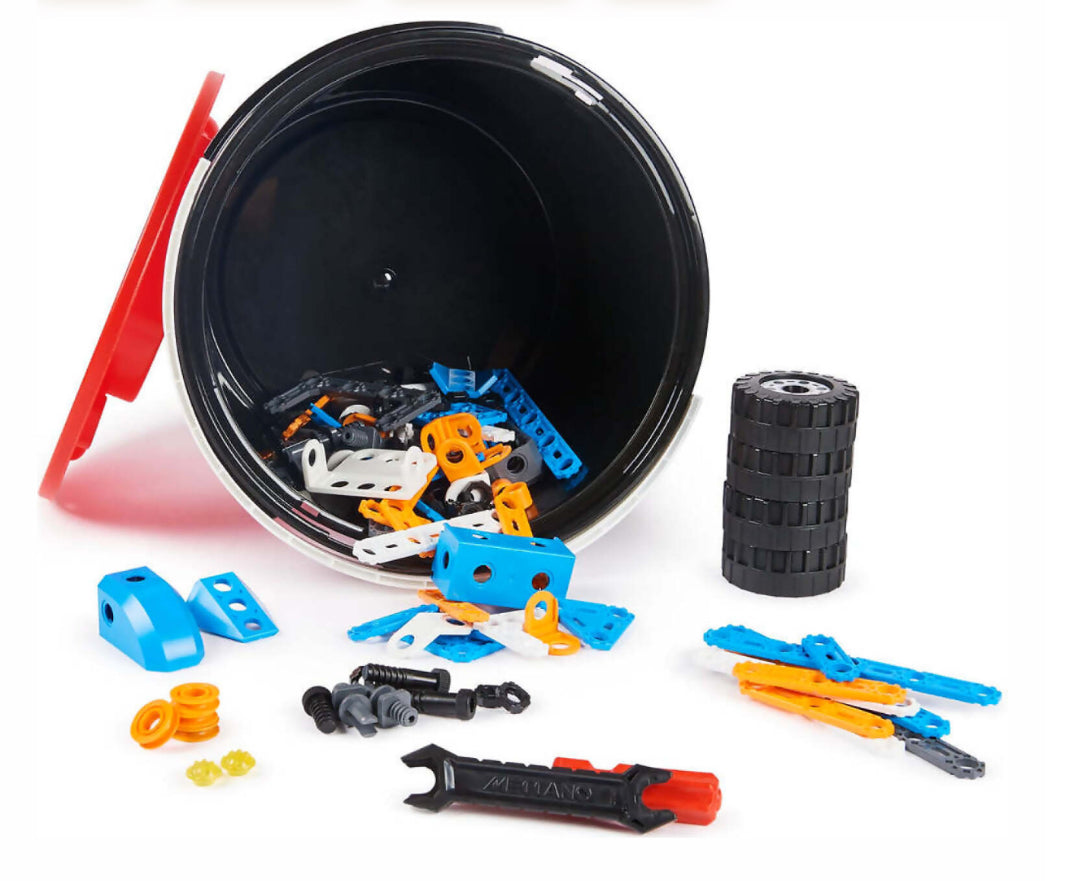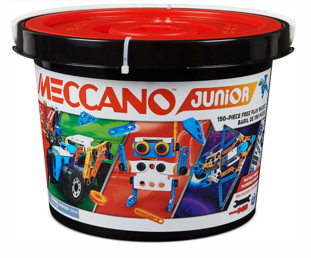 Give your child everything they need to build unlimited creations with this Meccano Junior 150-Piece Free Play Bucket. Ideal for first-time builders, this STEAM building kit comes with an easy-to-follow instruction sheet for three different builds to inspire creativity. With redesigned parts and tools, it's easier than ever before for kids to build a car, robot, space shuttle and more. Kids can snap nuts onto parts to make them lock, and use the bolts to hold pieces together and stay in place as they build. As your young inventor assembles their very own creations, they'll learn how principles from science, technology, engineering, arts, and math are practically applied. With so many pieces to use, your child can let their imagination run wild to assemble their own creations (all while building confidence). Proudly display your child's new builds or attach the tools onto the lid and store the pieces in the reusable bucket for later. With the Meccano Junior 150-Piece Free Play Bucket, the building possibilities are endless!