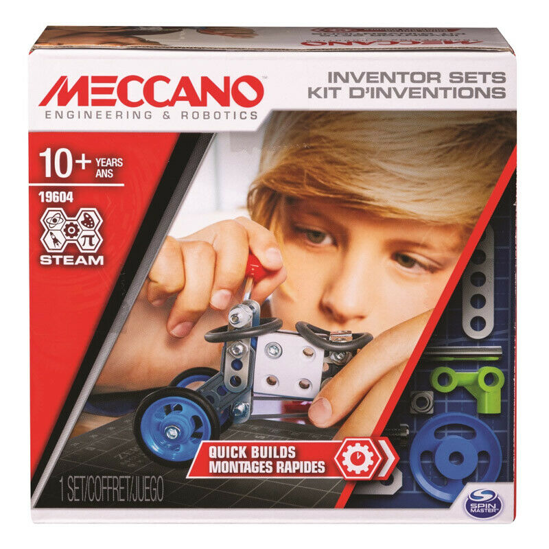 Introduce your budding engineer to the world of building things with this Meccano's inventor set. Ideal for curious minds, this S.T.E.A.M. set is the perfect way to show your young thinker how concepts from science, technology, engineering, arts and math are practically applied. Little builders will feel just like real engineers as they use real tools to start making all-new creations. As they use their tools to finish their builds, kids will feel an incredible sense of accomplishment. With so many possibilities, kids can build, disassemble, then build again and again! Give your child the tools they need to start building their future with the Quick Builds set from Meccano!