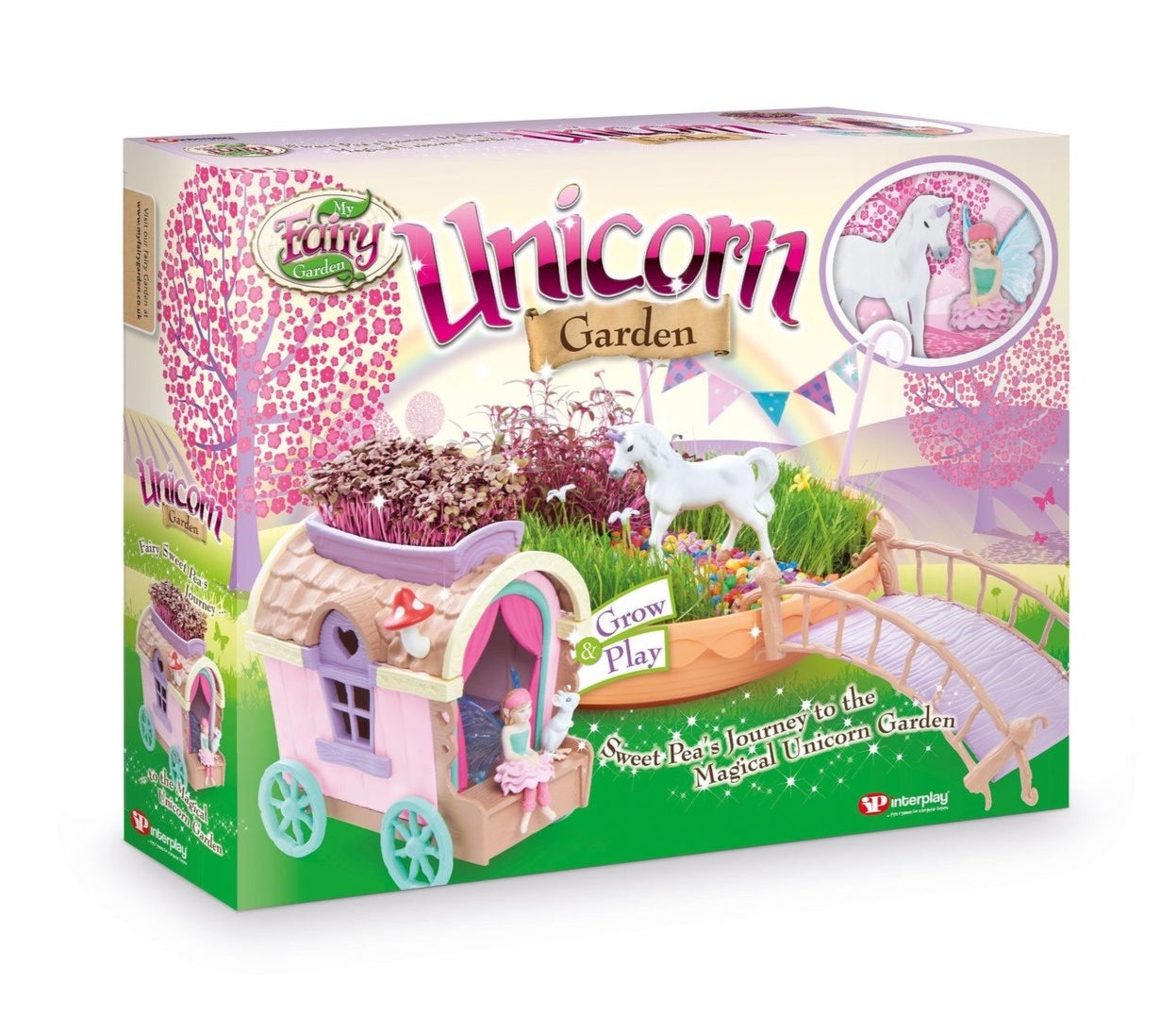 Create a magical Unicorn Garden inside your home! My Fairy Garden Unicorn Garden and Caravan is a Grow & Play playset that includes everything you need to make an enchanting garden that is sure to attract unicorns and fairies to your home! With a fairy bridge, a mouse, a mushroom and flowers galore, your fairy will have a garden and caravan to play and explore! Follow the activity guide to learn how to create a beautiful living fairy garden with the grass seeds provided.