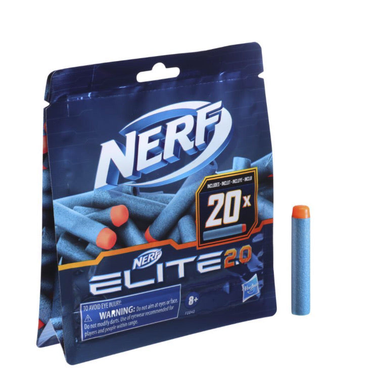 Stock up with this Nerf Elite 2.0 refill pack of 20 Official Nerf Elite 2.0 darts and have plenty of firepower on hand to reload your Nerf Elite 2.0 blasters! It happens all the time -- some darts go missing when you're blasting away in a Nerf battle. Instead of stopping the game and searching for darts, keep refills nearby so you spend less time looking for darts and more time playing! With this 20-dart refill set, you can reload Nerf Elite 2.0 blasters and keep on battling. Reload with Official Nerf foam darts -- they're tested and approved for performance and quality. Nerf Elite 2.0 darts are compatible with all Official Nerf blasters that use Elite darts. Gear up for battle with Nerf Elite 2.0 blasters that feature built-in customizing capabilities so you can upgrade them and seize the advantage in Nerf competitions! Blasters each sold separately. Eyewear recommended (not included).