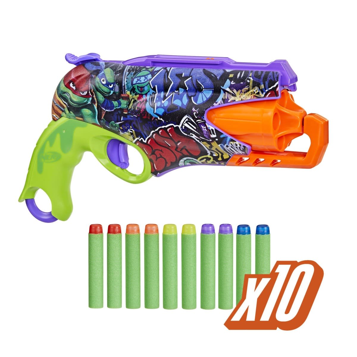 Cowabunga! Unleash mutant mayhem with the NERF Teenage Mutant Ninja Turtles dart blaster that's decorated with big, bright TMNT designs on both sides! The blaster is a perfect addition to any Teenage Mutant Ninja Turtles collection and an awesome blaster to bring to NERF outdoor games. The NERF blaster has a rotating barrel with five-dart capacity and includes 10 NERF Elite foam darts, so you can load the barrel and keep the remaining five darts in reach to reload as you battle. Send five darts in a row flying through the air with fun hammer-action priming. Easy to use, no batteries required! Load five darts into the barrel, pull back the hammer, and pull the trigger. It's a perfect gift for Teenage Mutant Ninja Turtles fans to add to their collections and an eye-grabbing blaster to bring to any NERF battle. NERF blasters are great toys for eight-year-old boys and girls and up to enjoy fun, active indoor and outdoor play. Eyewear recommended (not included).