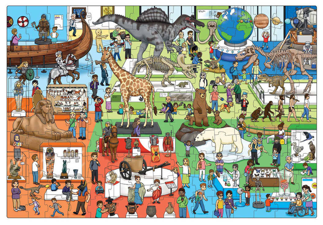 The Orchard Toys At The Museum Jigsaw Puzzle is a fun 150 piece activity toy. In this challenging beautifully illustrated puzzle you will discover and learn about interesting objects, animals, dinosaurs and more!