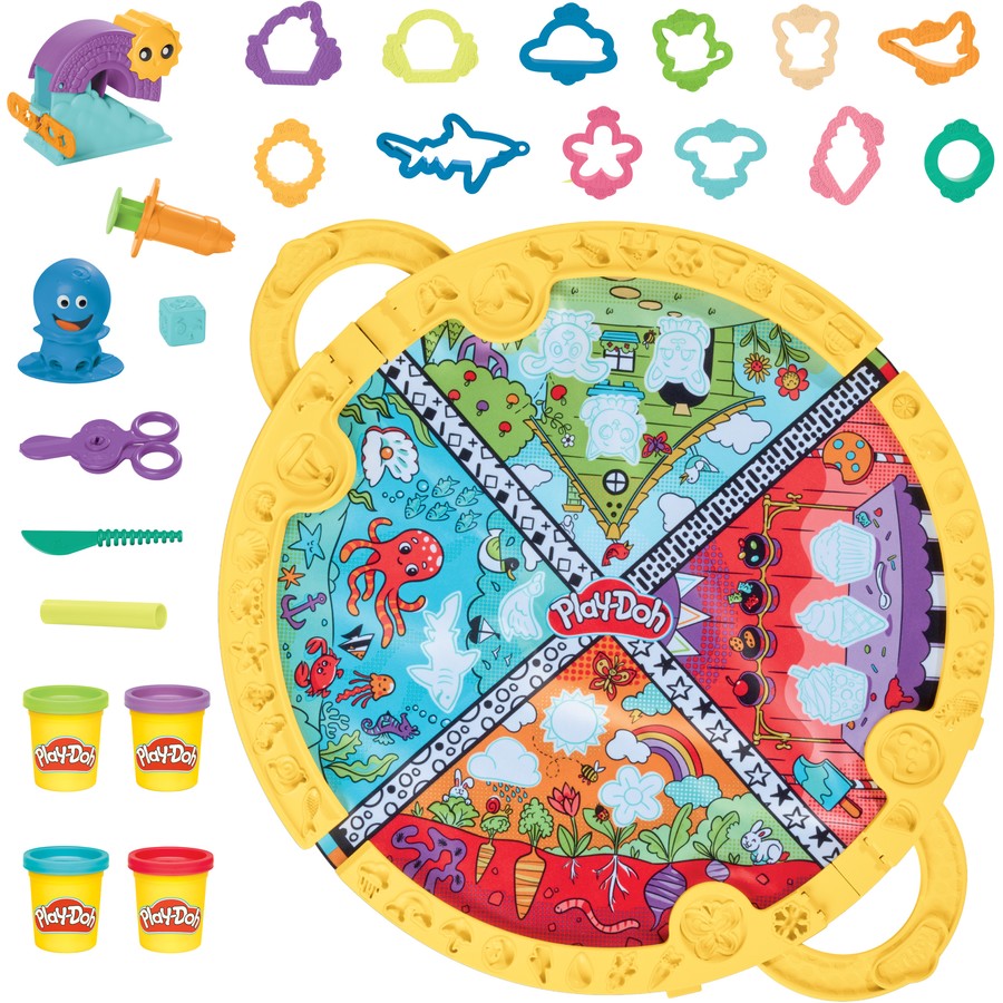 Let kids imagine almost anywhere with the Play-Doh Fold and Go Playmat! It's a perfect Play-Doh starter kit with a portable play mat, 19 Play-Doh accessories, and 4 squishy, moldable colors. The colorful fabric mat inspires lots of creative activities with fun tools that stamp, cut, and shape Play-Doh compound in lots of different ways. While kids create and play pretend, they can also explore topics like social-emotional skills, creativity, and preschool themes like animals and weather. It's a great addition to your tactile sensory toys and makes a wonderfully creative gift for 3 year old girls and boys and up.