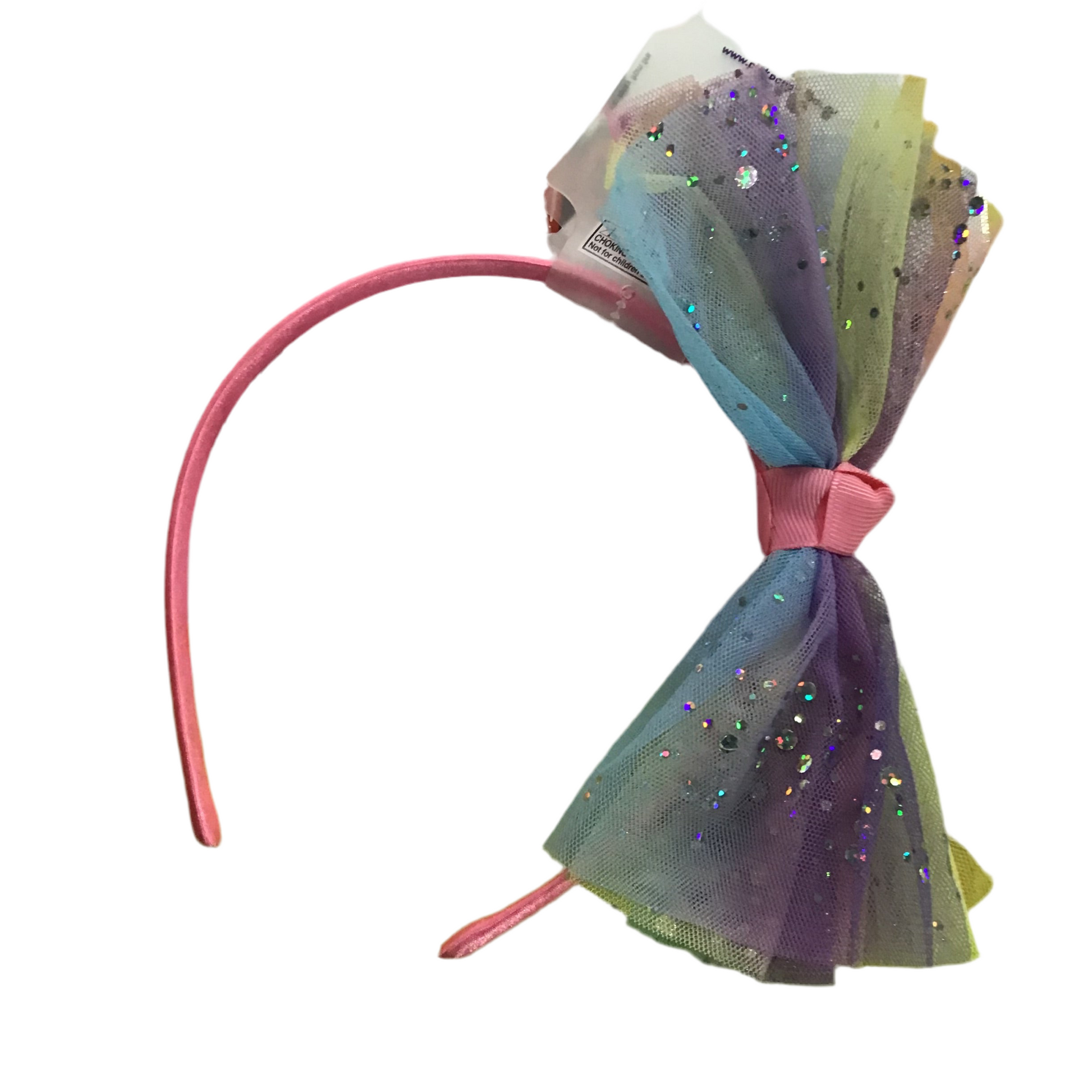 Pink poppy’s pastel rainbow headband, is scattered with sparkling gems, finished off in a beautiful bow.