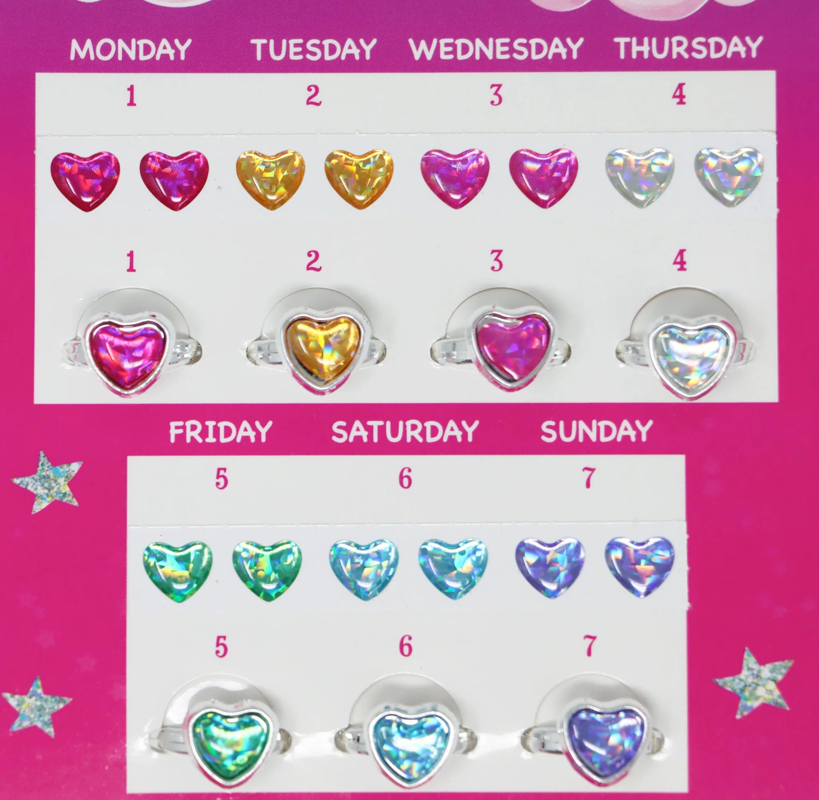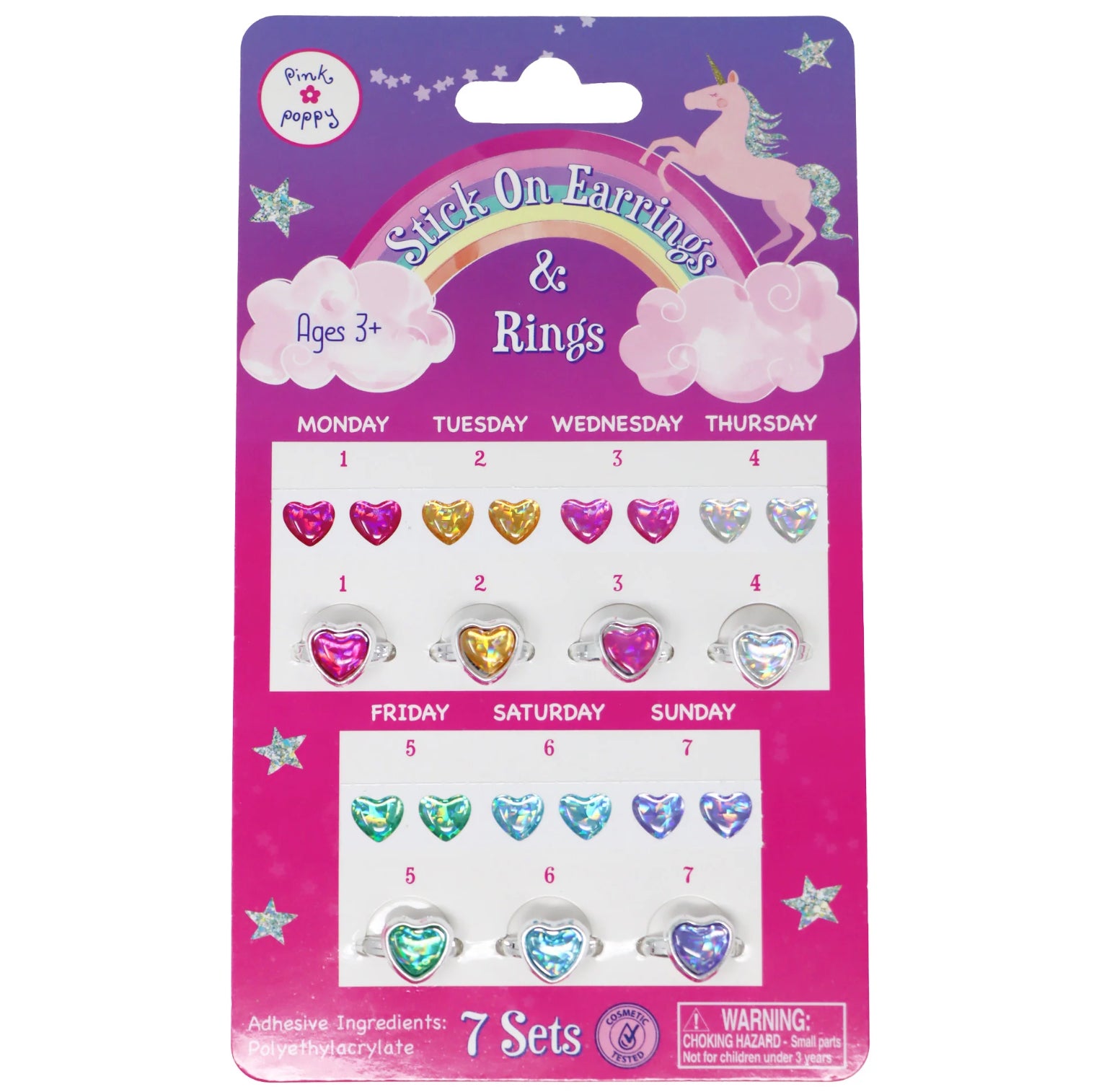 Pink Poppy's 7 Day Stick On Earrings & Ring Set. Accessorise with this fuss-free pack containing earrings and rings for every day of the week. Rings are lightweight and adjustable while the colourful & shiny fun-shaped adhesives can be placed on the ears without any piercing required. Safe for the skin with cosmetic testing.