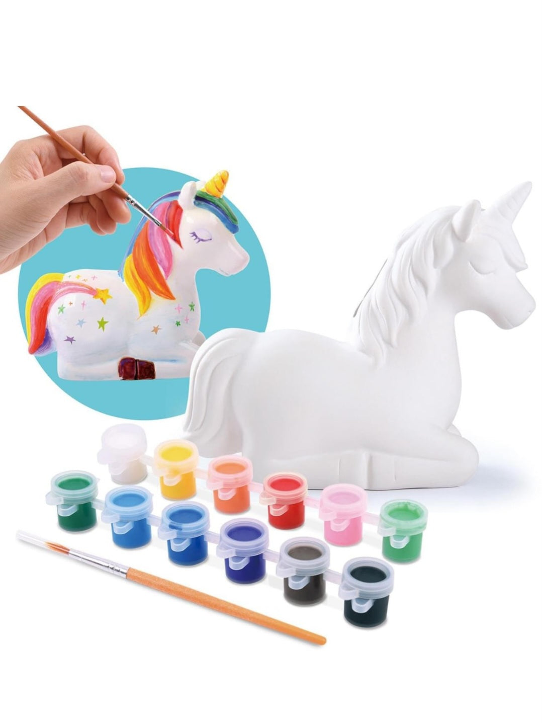 The kit includes everything needed to get started: 12 vibrant paints, a paintbrush, and a ceramic unicorn money box. The paints are non-toxic and safe for children, making it an ideal activity for young artists aged 5 and up. Whether it's for play, decoration, or saving pocket money, this unicorn money box is a perfect addition to any child's room.