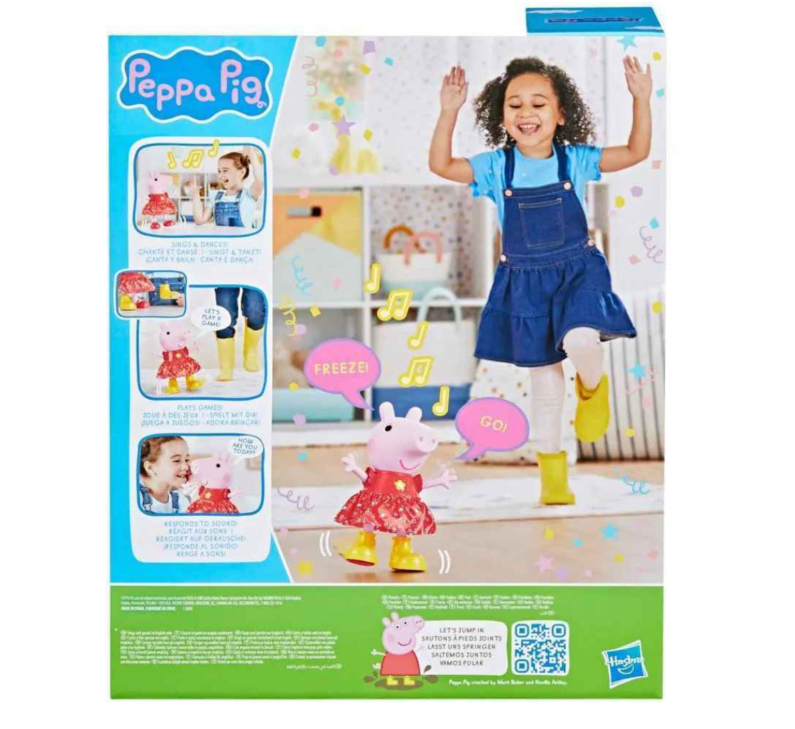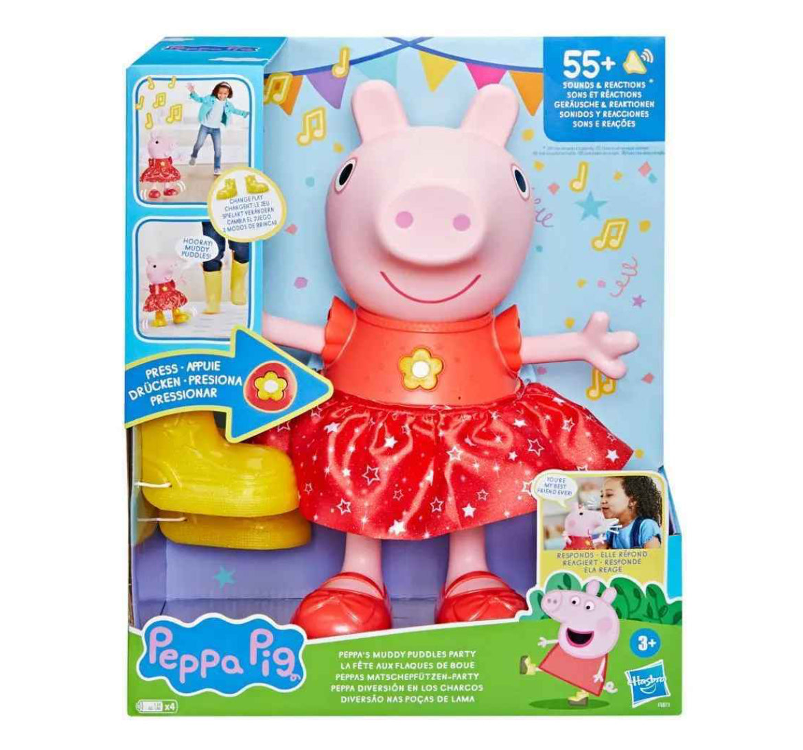 It’s a Peppa Pig party, and little piggies are invited to join the fun with Peppas Muddy Puddles Party doll! This interactive, talking, singing, dancing toy for kids 3 years and up will captivate little ones imaginations and get them moving and grooving with their best friend, Peppa! Kids can easily put on and take off Peppas iconic yellow wellies to put her in Muddy Puddles Mode or Party Mode and change the sounds and phrases, the song and dance, and the game.