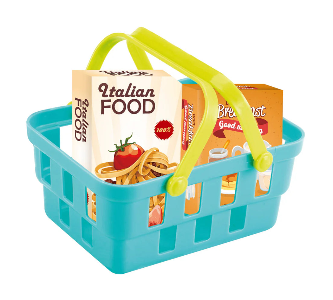 Electronic cash register with light & sound and calculator. The set contains food boxes, play money, toy credit card and a shopping basket.