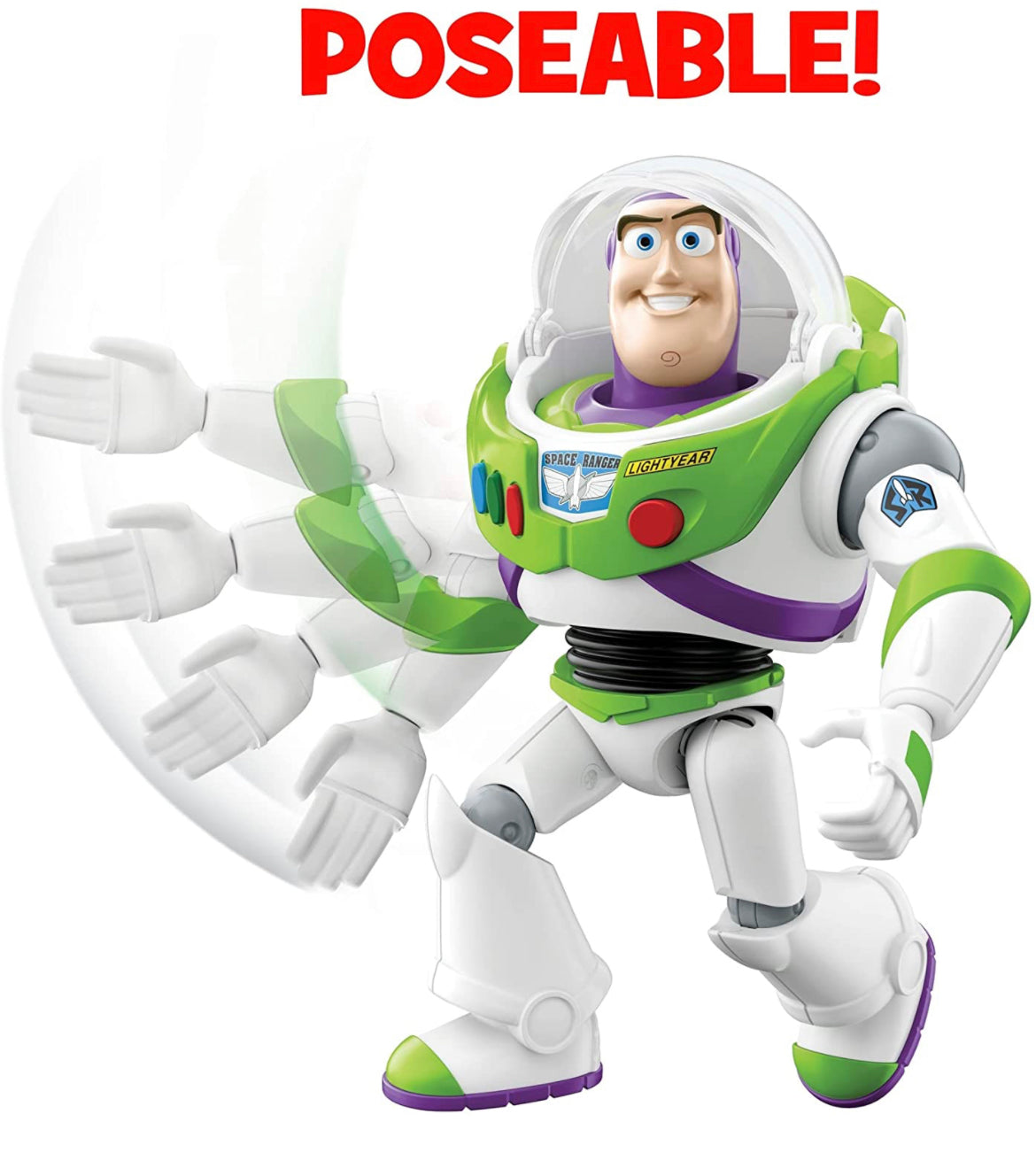There's a secret mission in uncharted space. Let's go! This large, talking, action-chopping Buzz Lightyear will bring big thrills and laughter to fans of the Space Ranger from Disney and Pixar's Toy Story. This 12 in scale action figure of the spaceman speaks 30+ movie phrases, like "To infinity, and beyond!" by activating the red button on his chest. And that's not all! He also makes a dynamic chopping action complete with sounds -just press the button on his back! With multiple movable joints in addition to the special features, fans will discover interactive fun on a large scale. This Buzz Lightyear figure has a truly movie-authentic look with his iconic Space Ranger suit, complete with a helmet that opens and closes. Kids can relive all their favorite scenes from the Toy Story films, with the phrases and action coming directly from Buzz himself. Colours, dimensions and decorations may vary.