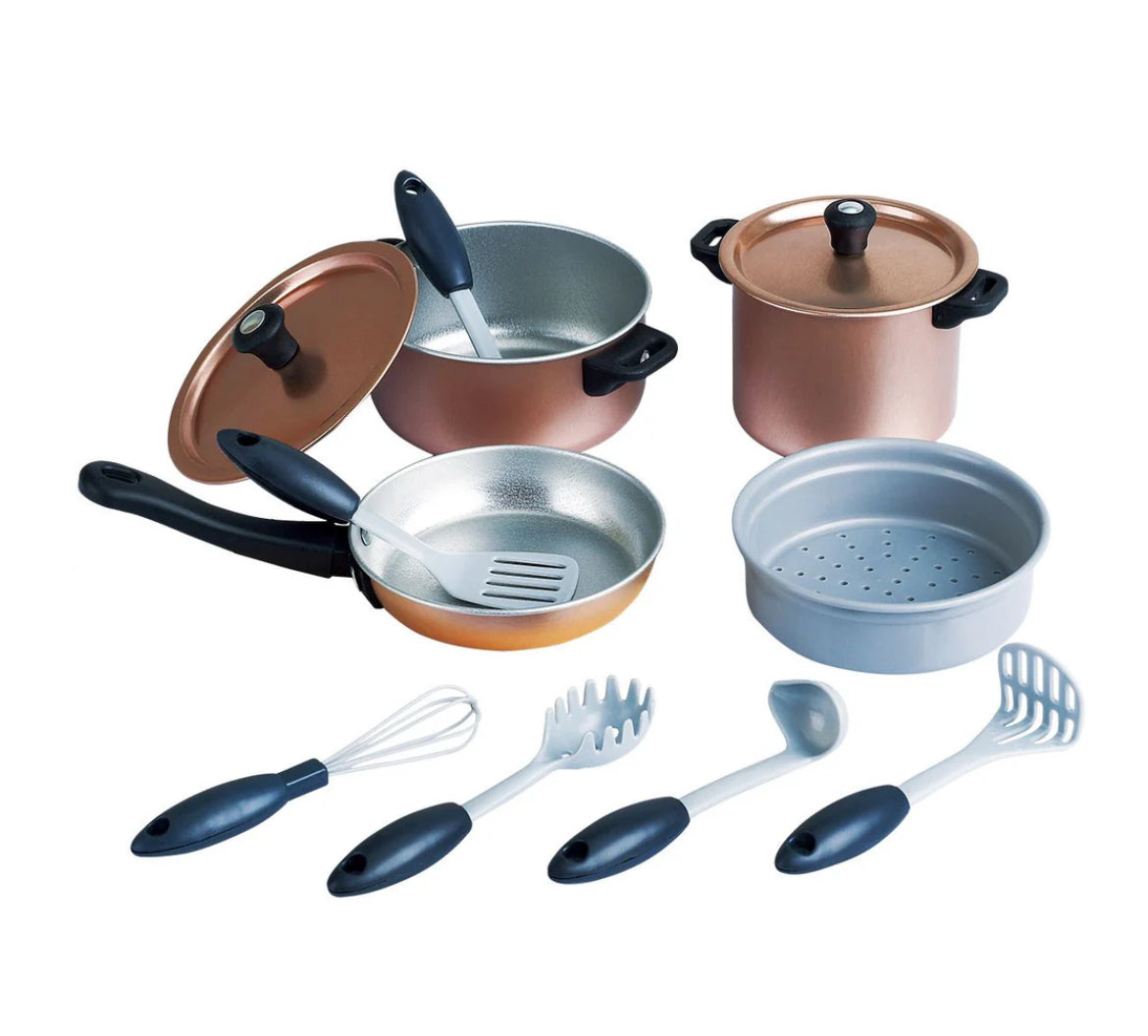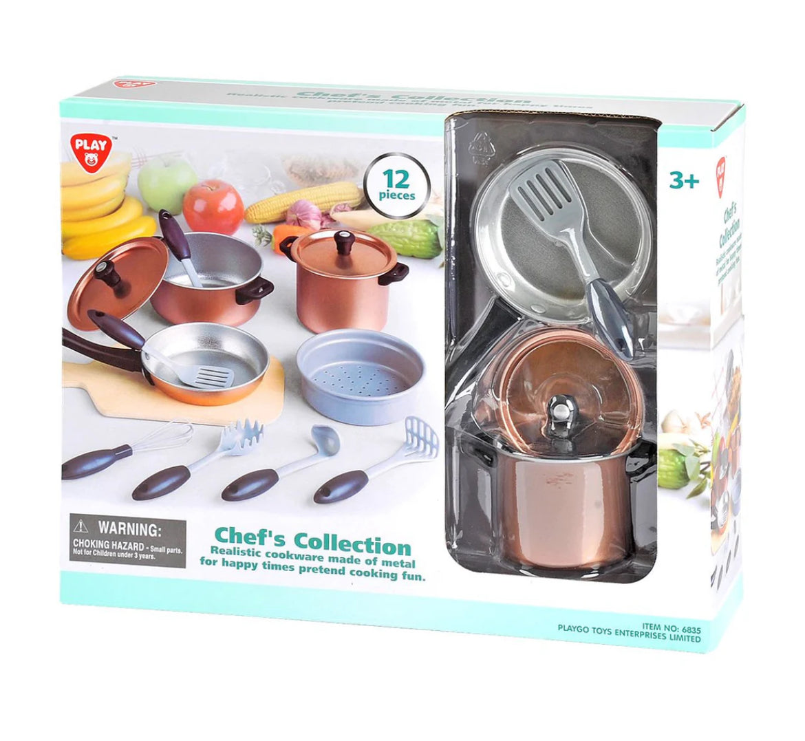 Teach your child some basic kitchen skills with the Playgo Chefs Collection Metal Set. Realistic metal cookware Consists of 12 pieces, perfect for cooking pretend-play.