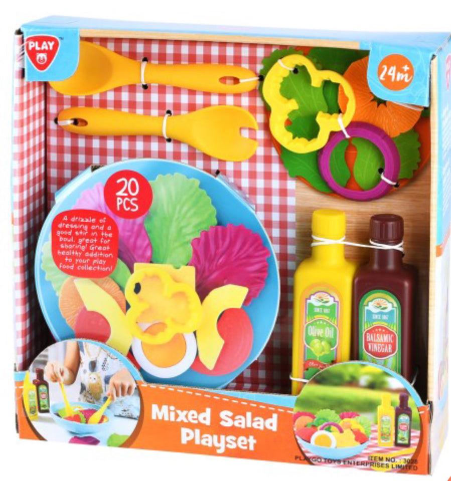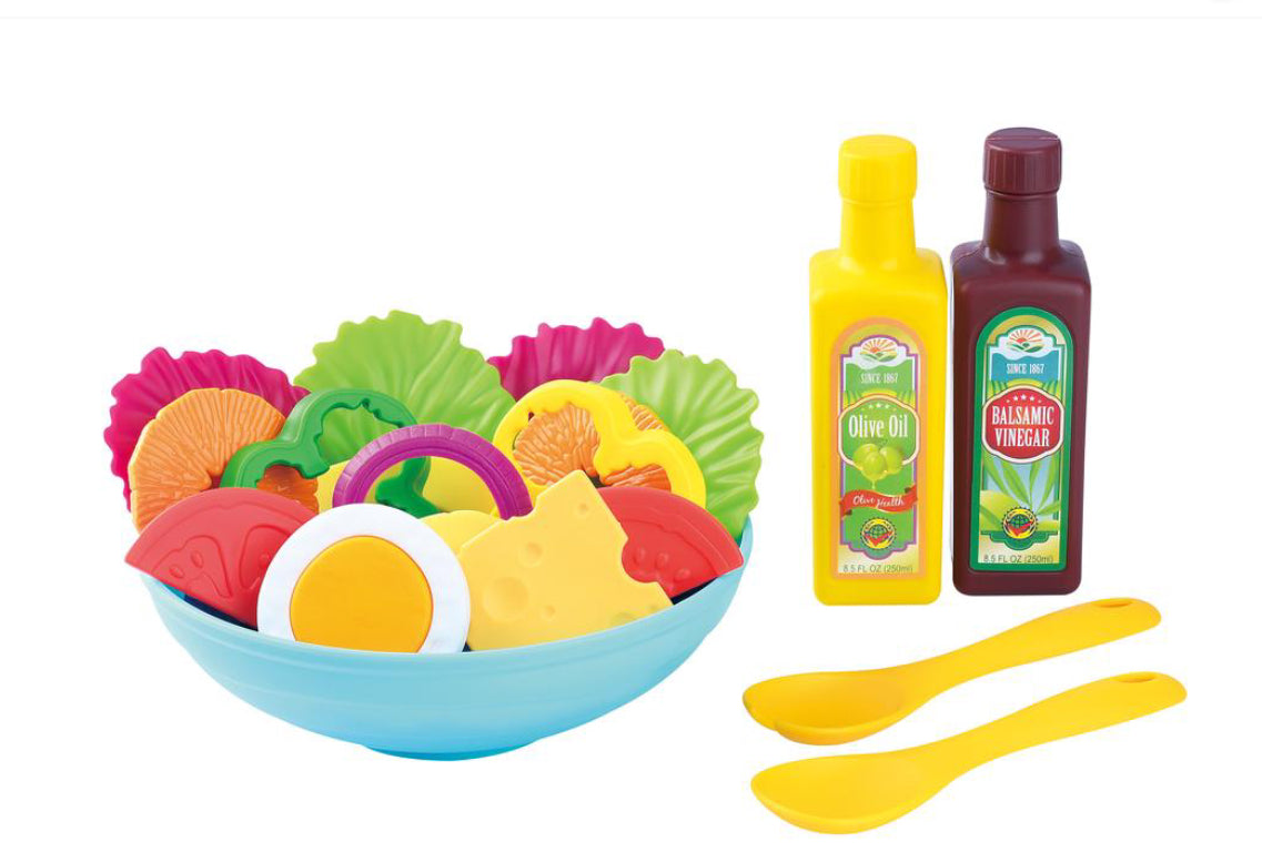Set includes 20 pcs. Great healthy addition to your play food connection.A drizzle and a good stir in the bowl, great for sharing.Realistic play foods.Fun imaginative role playing.Create a dining experience.