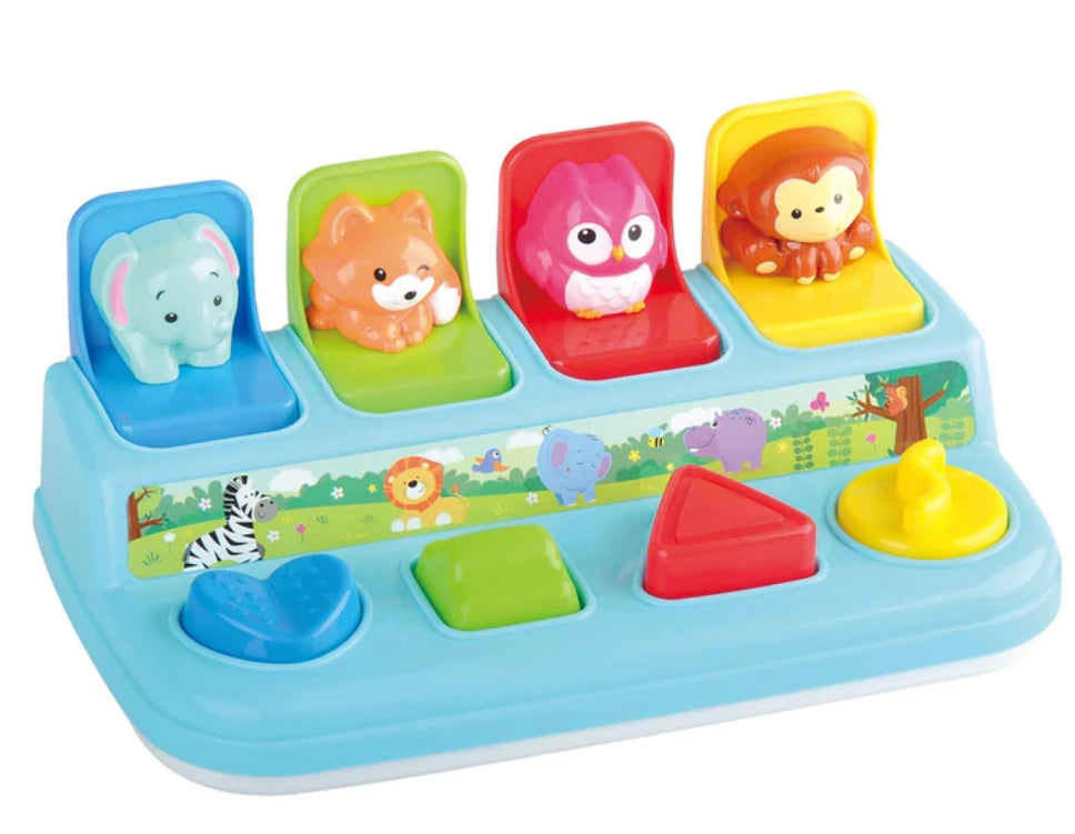 Built in animals pop up and reward your little one's curiosity. Or be entertained with colourful shape sorting and introduce them with first words, shapes, numbers and colours.