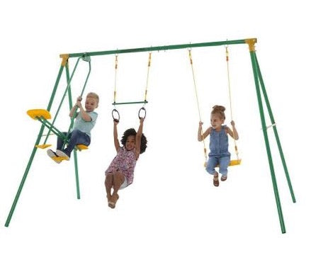 Compact design for safe play for up to 4 children. Includes dual glide ride, roman rings/trapeze bar & single swing.