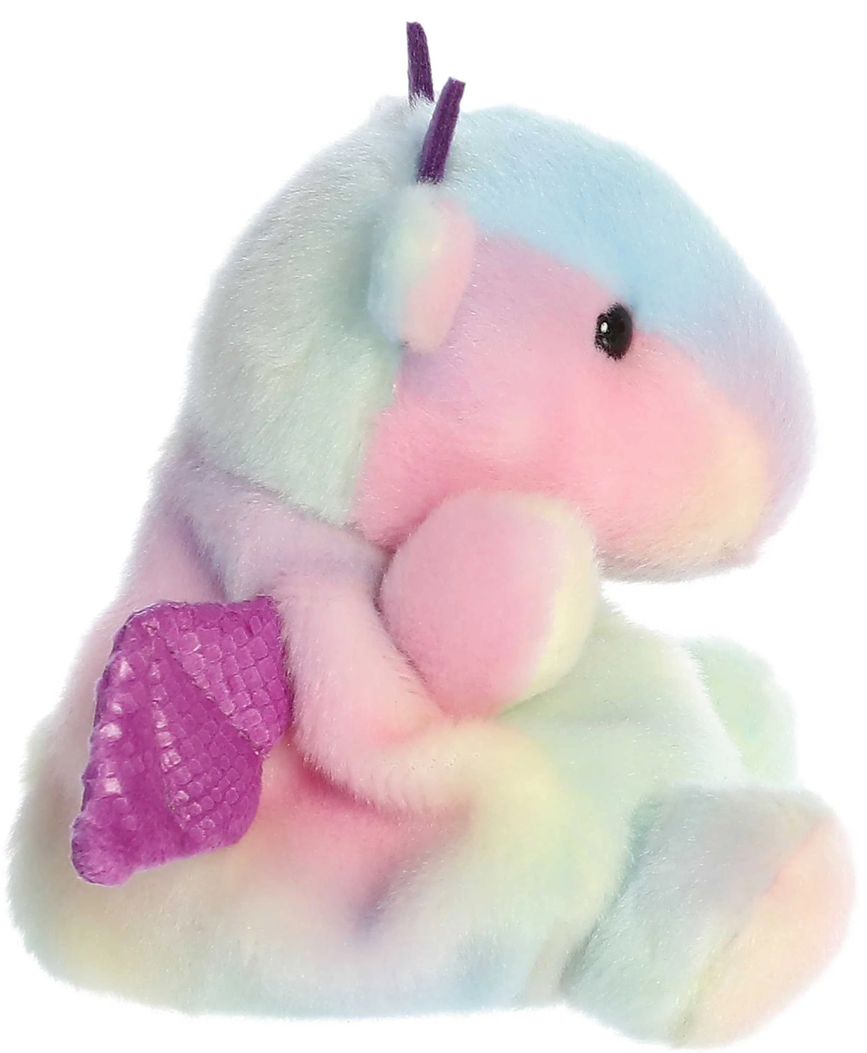 Aster Dragon is a plushie with a soft blend of pastel colors across her body and majestic purple wings ready for flight, complemented by tiny horns, hinting at her fiery spirit.