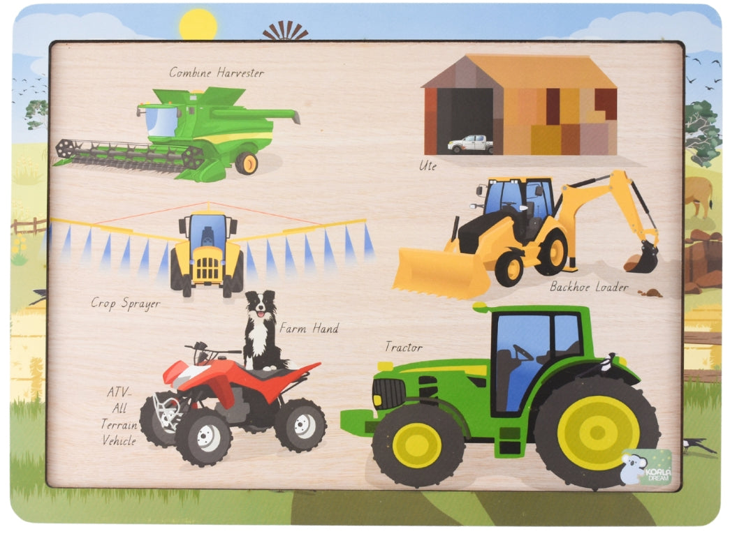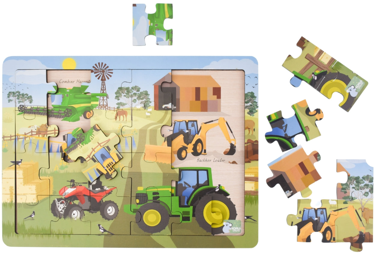 Each piece showcases iconic farm vehicles against a backdrop of rolling landscapes, offering a vivid glimpse into the agricultural heart of Australia. The puzzles large, easy to handle pieces are perfect for small hands, ensuring a satisfying and enjoyable experience for children as they piece together this engaging scene.