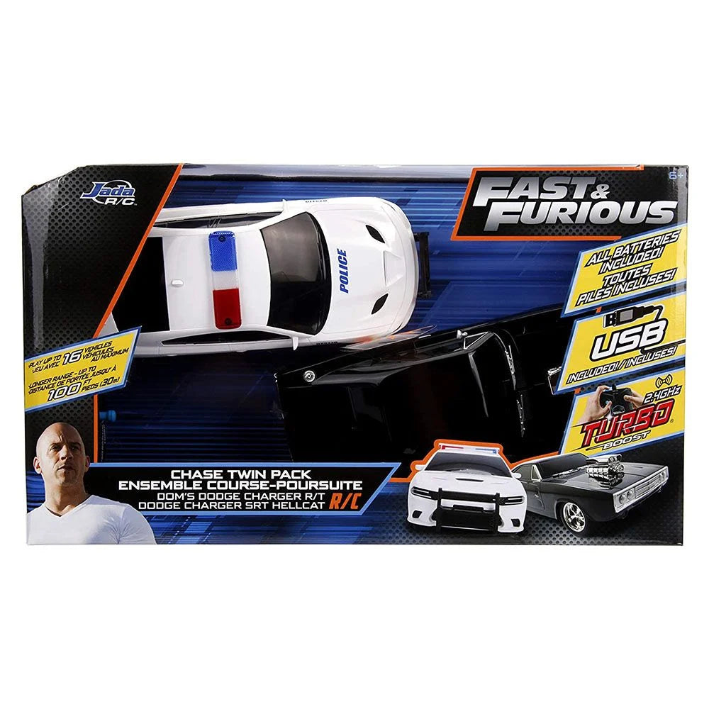 Bring the action home when you control Dom's 1970 Dodge Charger & 2015 Dodge Charger Police with this Fast & Furious chase twin pack. Each rechargeable car has its own built-in USB cable for quick and easy charging with most powered USB ports. Two controllers with included AA batteries means double the fun and racing action with this Fast & Furious chase twin pack.