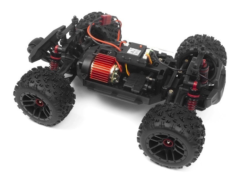 A strong shaft drivetrain and 3-gear differentials get power to the ground through all four wheels for amazing stability and handling. The ATOM is fitted with a cage-reinforced custom screen printed truck body, available in four colors for monster truck scale looks. Each ATOM comes with body color-matched shocks, a motor heatsink and wheel centre accessories! Performance block tread rubber tires provide grip and control, aided by the color-matched sprung shock absorbers.