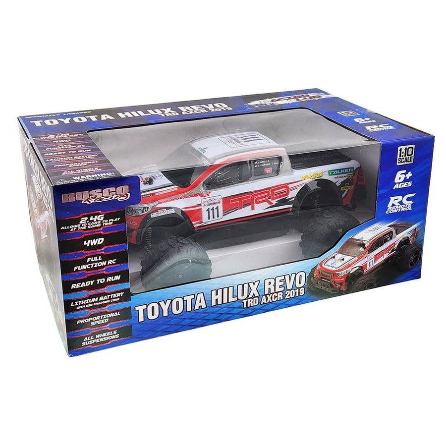 Rusco Racing 1:10 Toyota Hilux TRD Ute. Complete with Pack and USB cord for fast recharge and 20+ Km/h speed. Four wheel drive and off road suspension for ultimate action. 2.4G for multi racers.