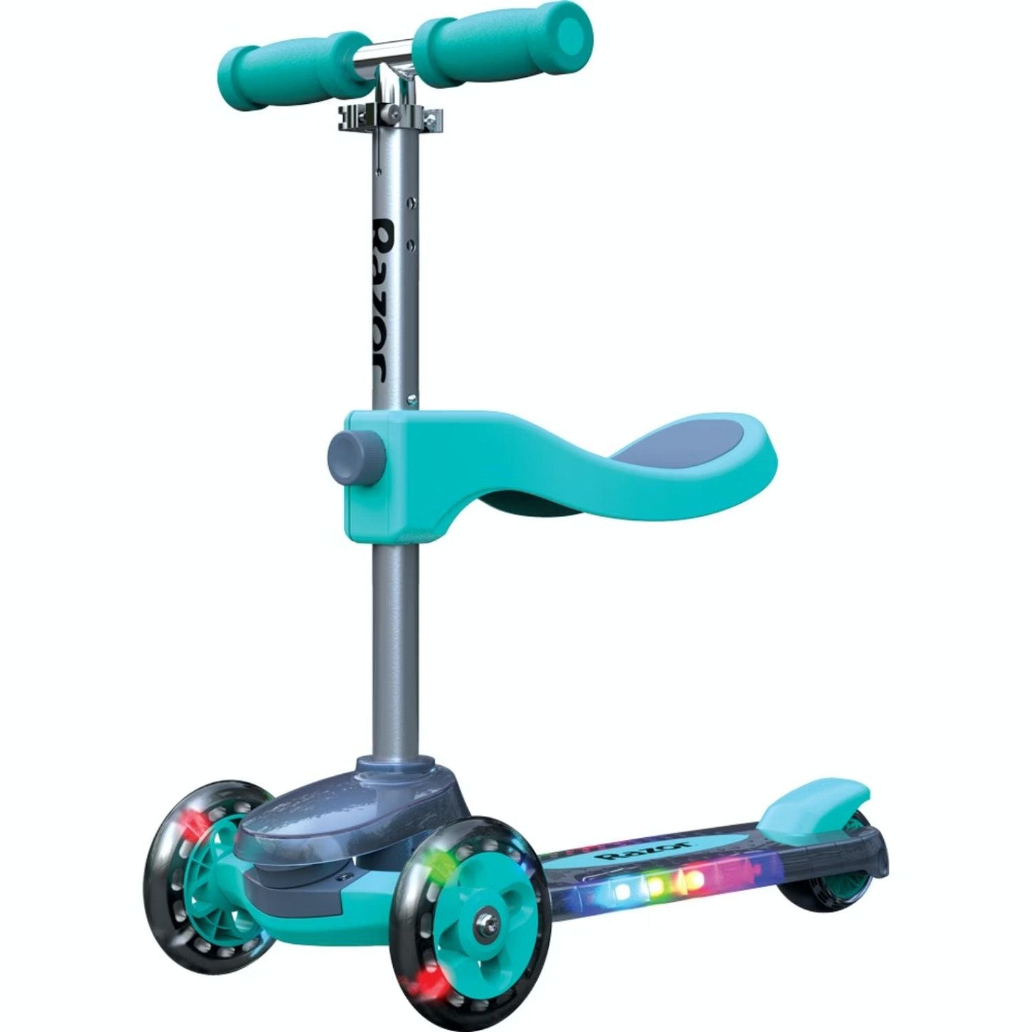 - Multi-Color Light-Up Front Wheels & Deck – The multi-color LED lights in the front wheels and the deck will illuminate when the scooter is in motion