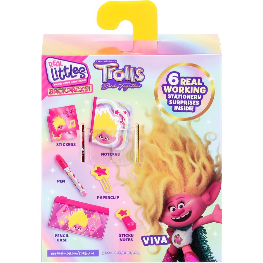 Real Littles Trolls - Band Together Backpacks: these cute and extremely colourful Backpacks are filled with the cutest mini collectible surprises to find! Your child's favourite Trolls characters have become mini Backpacks including Poppy, Branch, Viva and Satin & Chenille! Each adorable little Backpack is themed using the coolest sparkly materials and finishes. Unzip and open each Backpack to reveal 6 of the cutest Trolls themed stationery surprises inside to match the Backpack! What will be inside? These are tiny toy school supplies made mini, but they all really work! There could be tiny Pencil Cases, Novelty Pens, Erasers, Notebooks, Postcards, Stickers and more!
