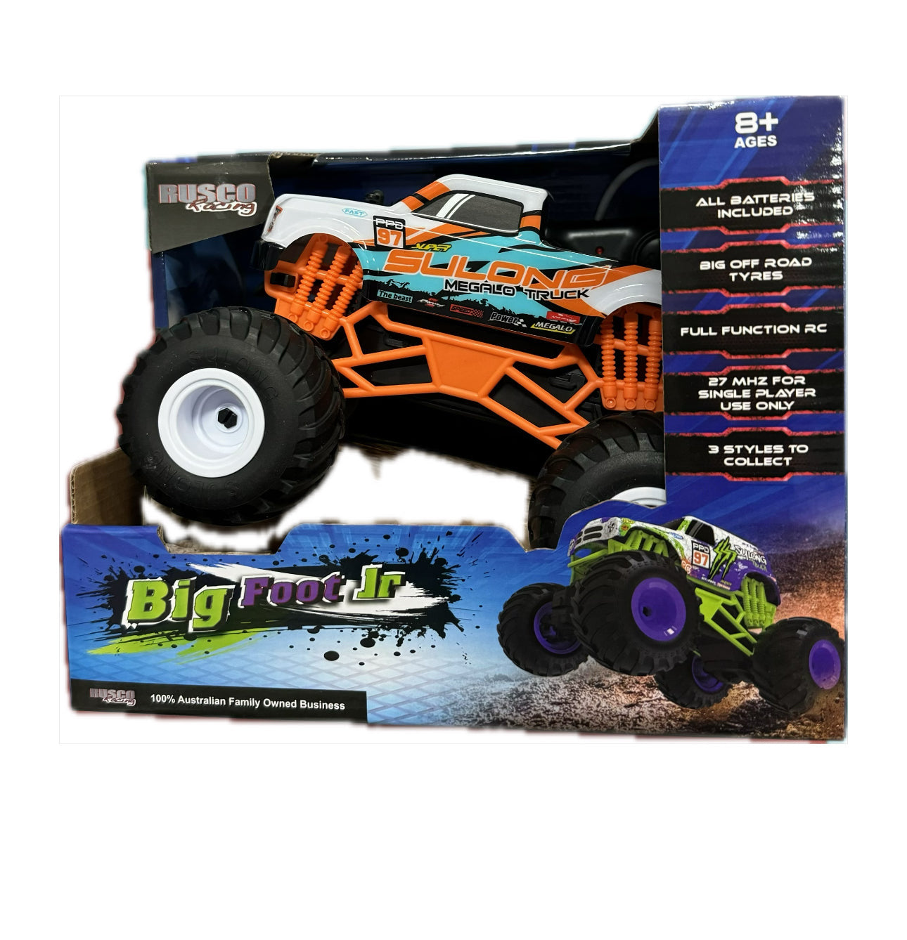 Get ready to go off-road with the R/C Rusco Big Foot Jr Off Road Buggy. Featuring the trusted brand of Rusco Racing and a remote control for easy driving, this buggy is perfect for ages 8 and up. With all batteries included and big off-road tires, you're in for an adrenaline-packed ride. Choose from 3 different styles and experience the power of 27 mhz for single player use.