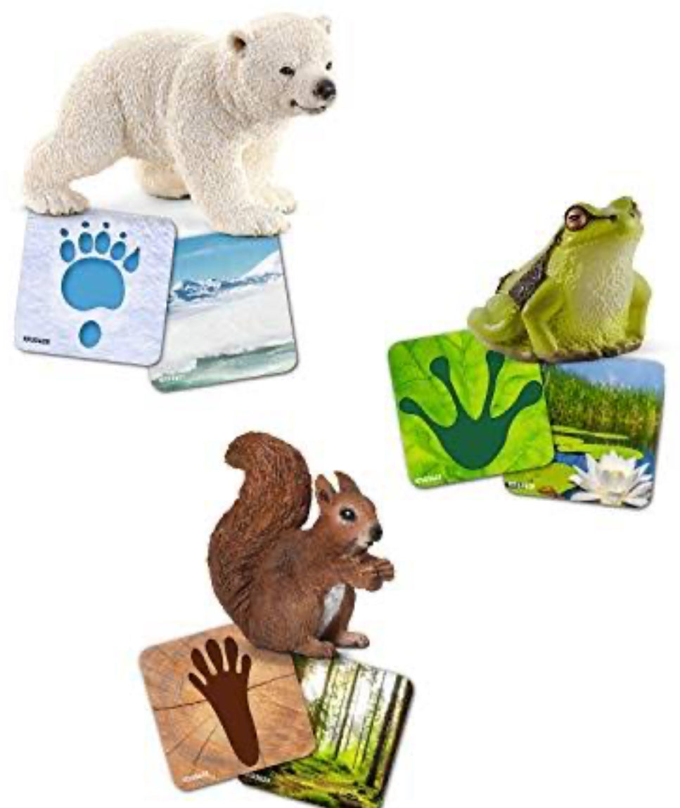 Get to know the animal world with the flash cards from Schleich! The flash cards show the habitat and footprint of three animals: the polar bear cub, the squirrel and the green tree frog. Which card belongs to which animal? Put the cards next to the three animal figurines that are also included in the set! Fun fact: The Wild-Life set contains two exciting flash cards and two animal figurines.