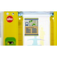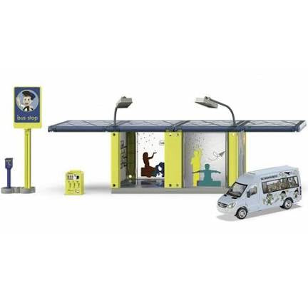 Wait under cover for the school bus. Rain, snow, and cold: Sometimes the weather is nasty when youre waiting for the school bus. The SIKUWORLD now has a new, smart bus stop with a transparent roof and walls. With its ticket machine, advertising sign, and emergency call point, the bus stop has lots of detail to play with. Time passes quickly: Here we are: the light blue school bus with coloured printing is already on its way. A Mercedes-Benz Sprinter is already included. The bus stop is also ideal for combining with the siku buses and trams, or it can be used as a cruise ship terminal.