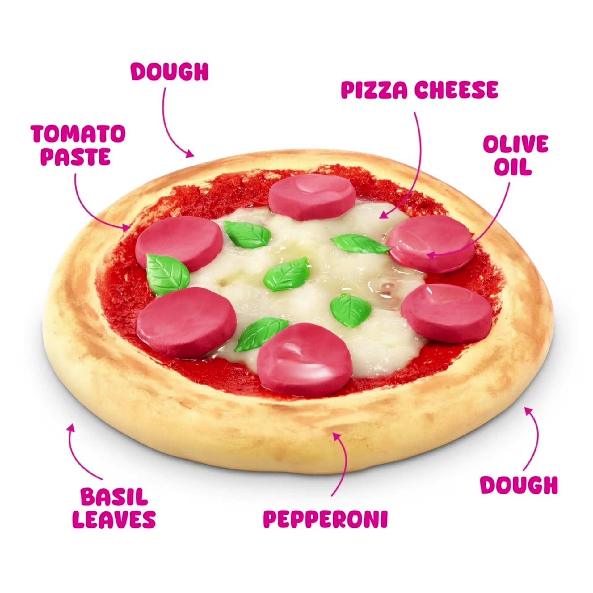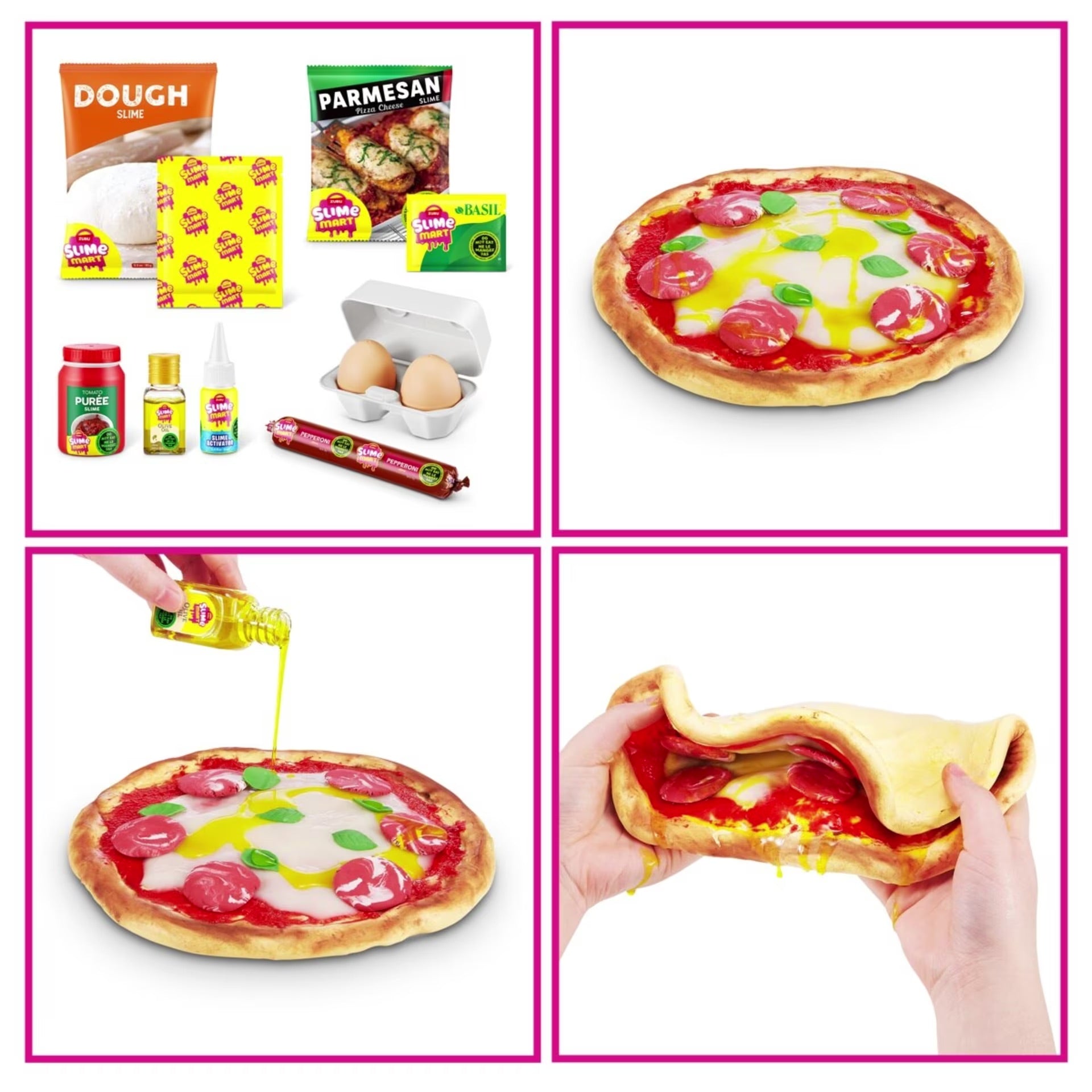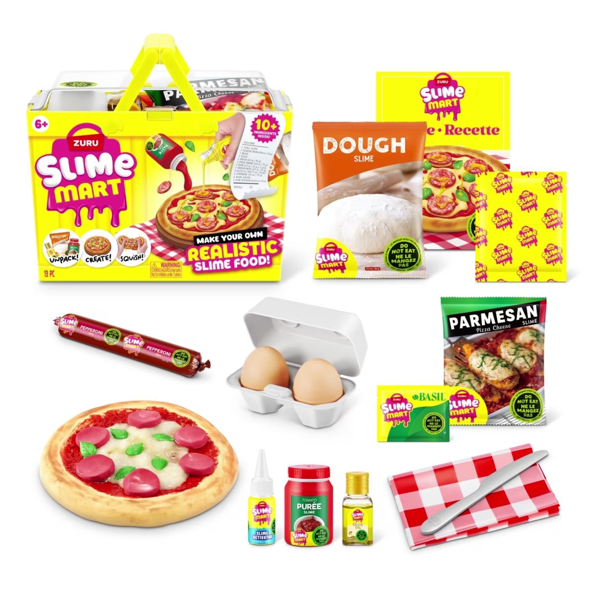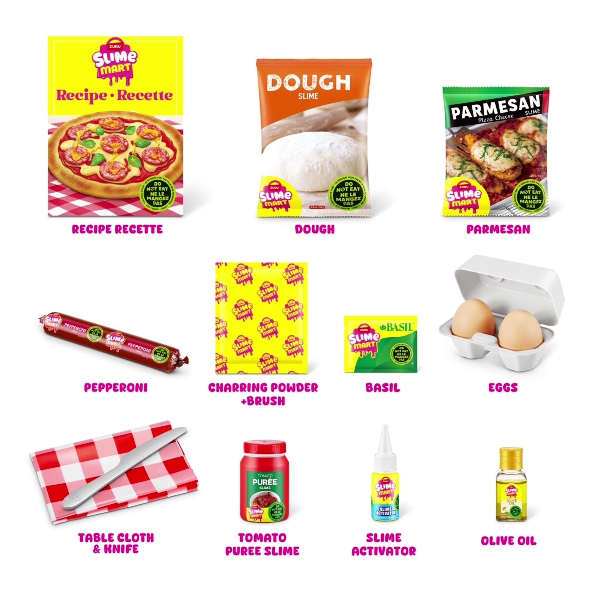 - Includes 1 x table cloth, 2 x charring, 1 x brush, 1 x knife, 1 x dough, 1 x pizza cheese, 1 x eggs pack (2 pieces), 1 x tomato paste, 1 x olive oil, 1 x pepperoni, 1 x basil leaves, 1 x slime activator