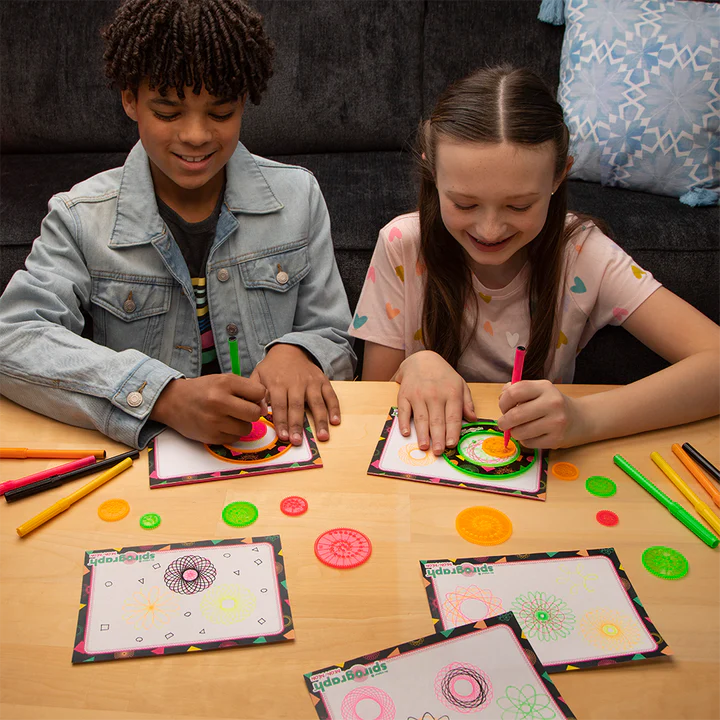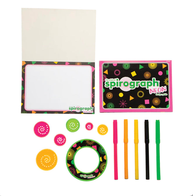 The classic way for aspiring artists to create millions of amazing designs now comes in neon. Draw bold Spirograph designs in bright neon colours with vibrant wheels to match. Use it on its own or mix and match with other Spirograph design pieces for even more design possibilities. Contains: 6 wheels, 1 ring, 10 sheets of design paper, 1 storage tray, 5 markers and a 10 page design guide book. Ages 8+The classic way for aspiring artists to create millions of amazing designs now comes in neon.
