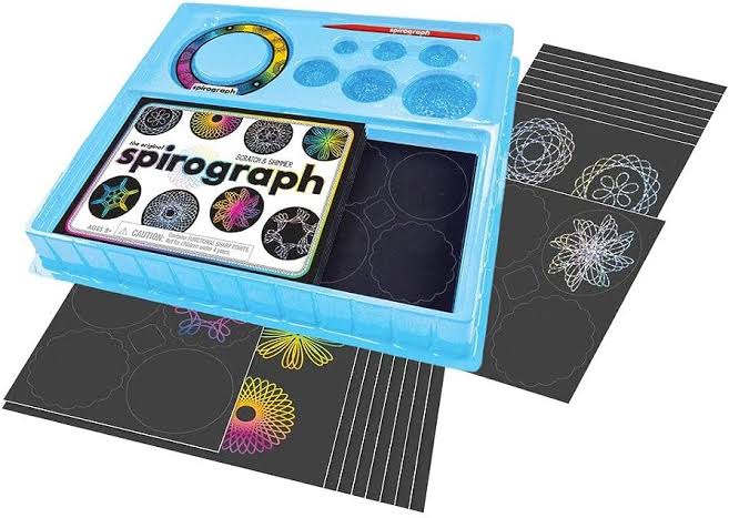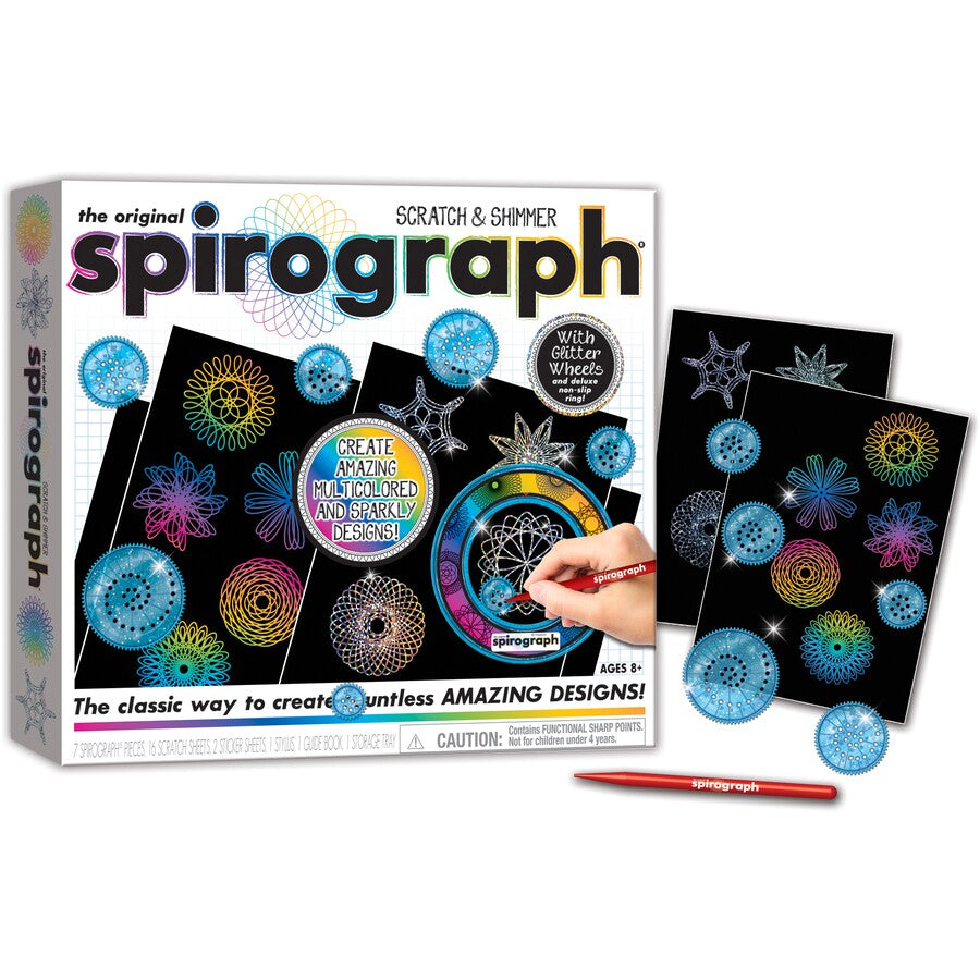 Now you too can create your own glittery designs and unique pictures with the help of this sparkly Spirograph Scratch & Shimmer Set. Use the stylus tool, deluxe non-slip ring and glittery gears to scratch beautiful designs on the special coated paper! Add your own special touch to all of your designs with the sparkly or rainbow scratch stickers. This set can also be used with the classic Spiro pens and paper! This amazing set includes 1 drawing stylus pen, 1 deluxe non-slip ring, 6 glitter wheels, 8 sparkly scratch sheets, 1 sparkly sticker sheet, 8 rainbow scratch sheets, 1 rainbow sticker sheet, built-in storage tray and a 10 page design guide. Everything you need to create colourful Spirograph masterpieces! Suitable for ages 8 and up.