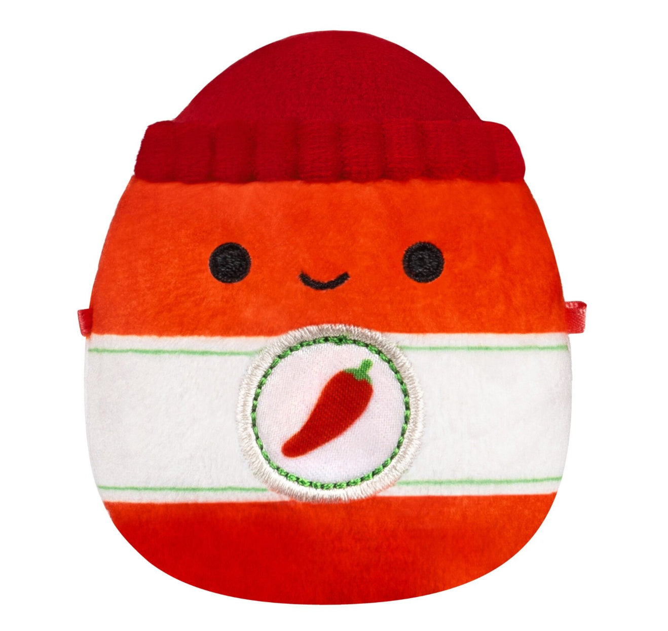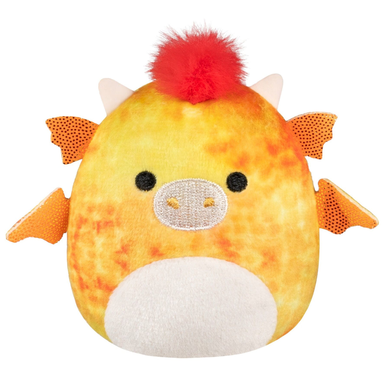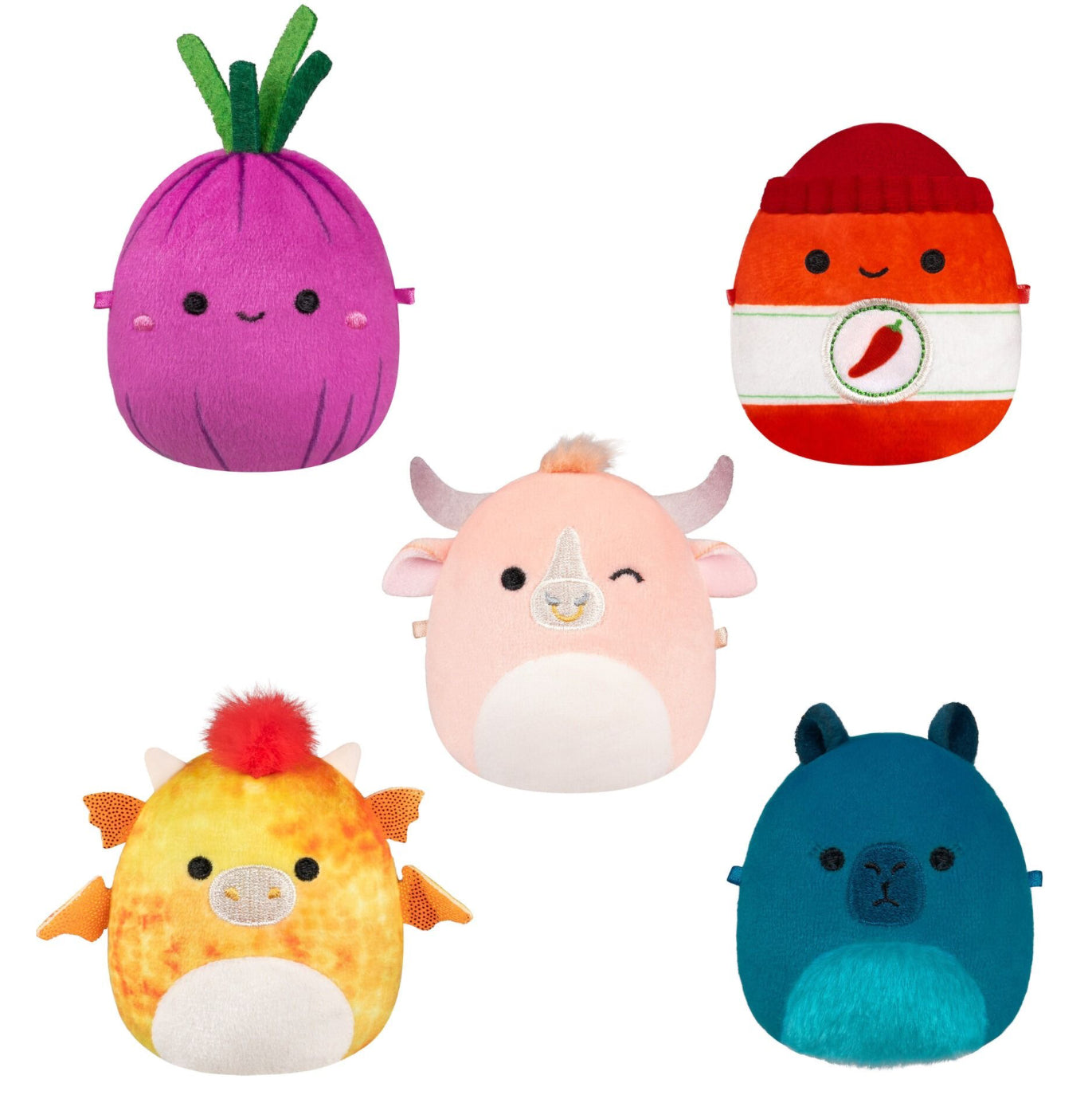 This Micromallows plush 5-Pack includes Squishmallows favorites Dieric the Dragon, Azizbek the Red Onion, Illia the Hot Sauce, Cyril the Capybara, and Howland the Brahma Bull.