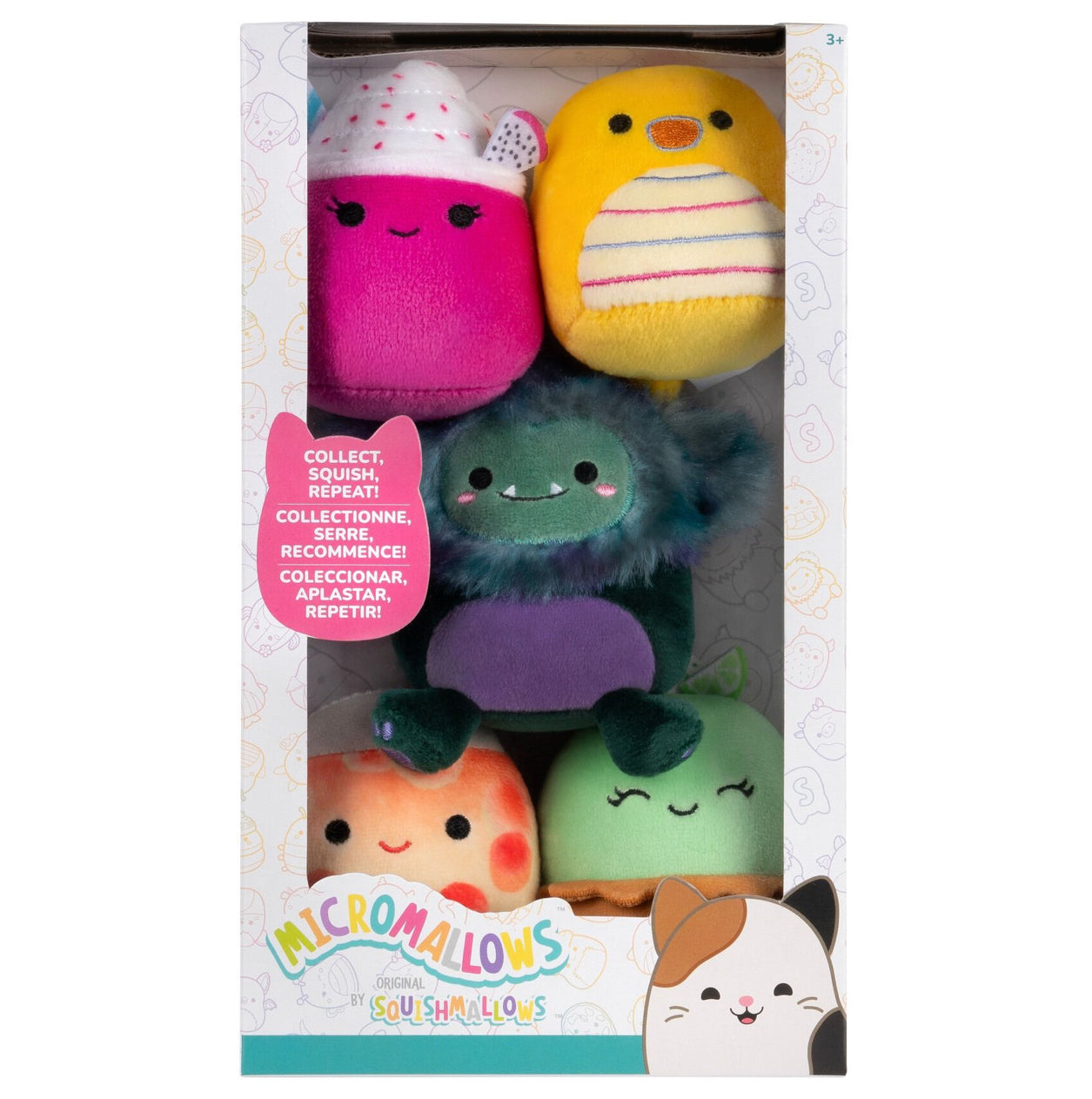 This Micromallows plush 5-Pack includes Squishmallows favorites Adella the Lava Lamp, Largo the Key Lime Pie, Nicota the Dragon Fruit Milkshake, JT the Bigfoot, and Leif the Leafy Seadragon.