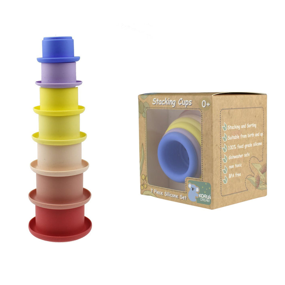 Introducing the 7-piece Silicone Stacking Cups from Koala Dream, a perfect toy for small children that encourages open play and learning. Each colourful cup neatly stacks into one another, providing endless stacking and sorting possibilities. Designed with versatility in mind, these cups can be stacked to build towers or sorted to explore size relationships. Children can enjoy hours of engaging play as they sort various objects into each cup, choosing between the larger or smaller cups to enhance their cognitive skills. These stacking cups are not limited to dry play only; they are also great for water play. Whether it's in the bath or at the beach, children can have fun pouring and scooping water with these cups.