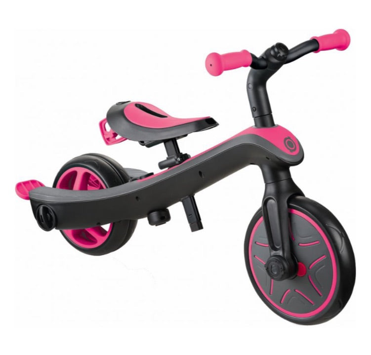 The Globber Explorer Trike 4 in 1 Pink is the ALL-IN-ONE DESIGN EXPLORER TRIKE is equipped with our patented wheel mechanism to easily and quickly convert the two rear wheels into a double width wheel without any tools, to transform the product from a tricycle to a balance bike!