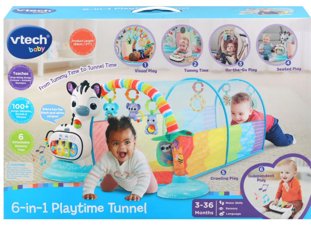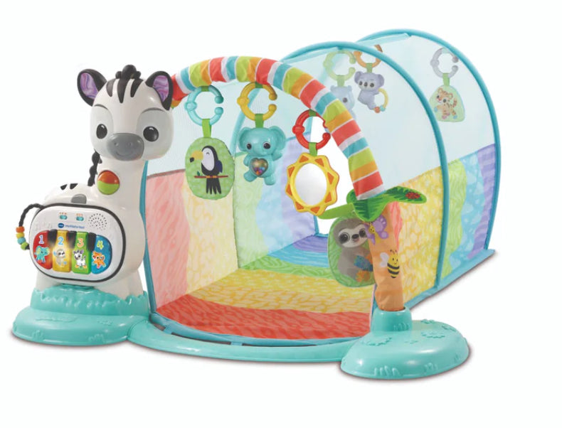 Meet Zebra and their fun multi-coloured 6-in-1 Playtime Tunnel by VTech! Detach the electronic piano panel for on-the-go play. Press the light up piano keys for fun responses. Little one can spin the beads on the piano handle and flip the Sloth around the arch tree to develop their motor skills. The soft fabric arch and leaves promote tactile stimulation and sensory discovery. Little one can explore and crawl through the see-through rainbow mesh tunnel.