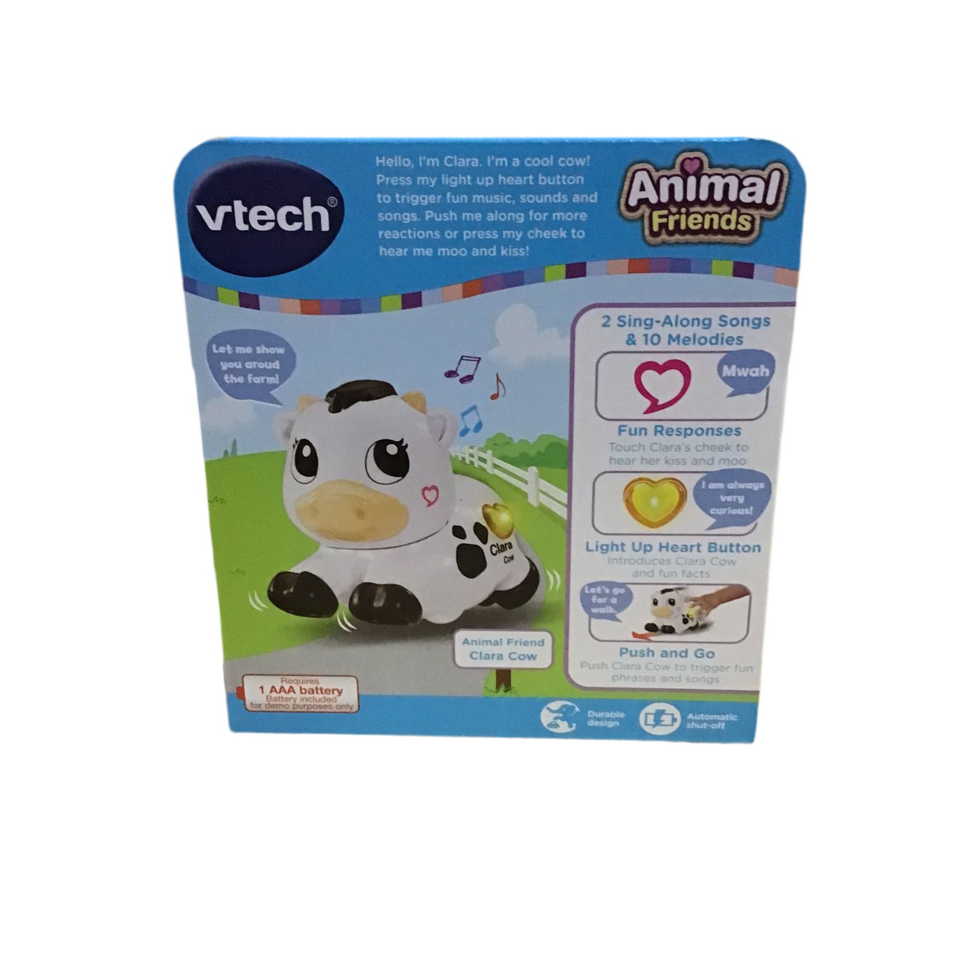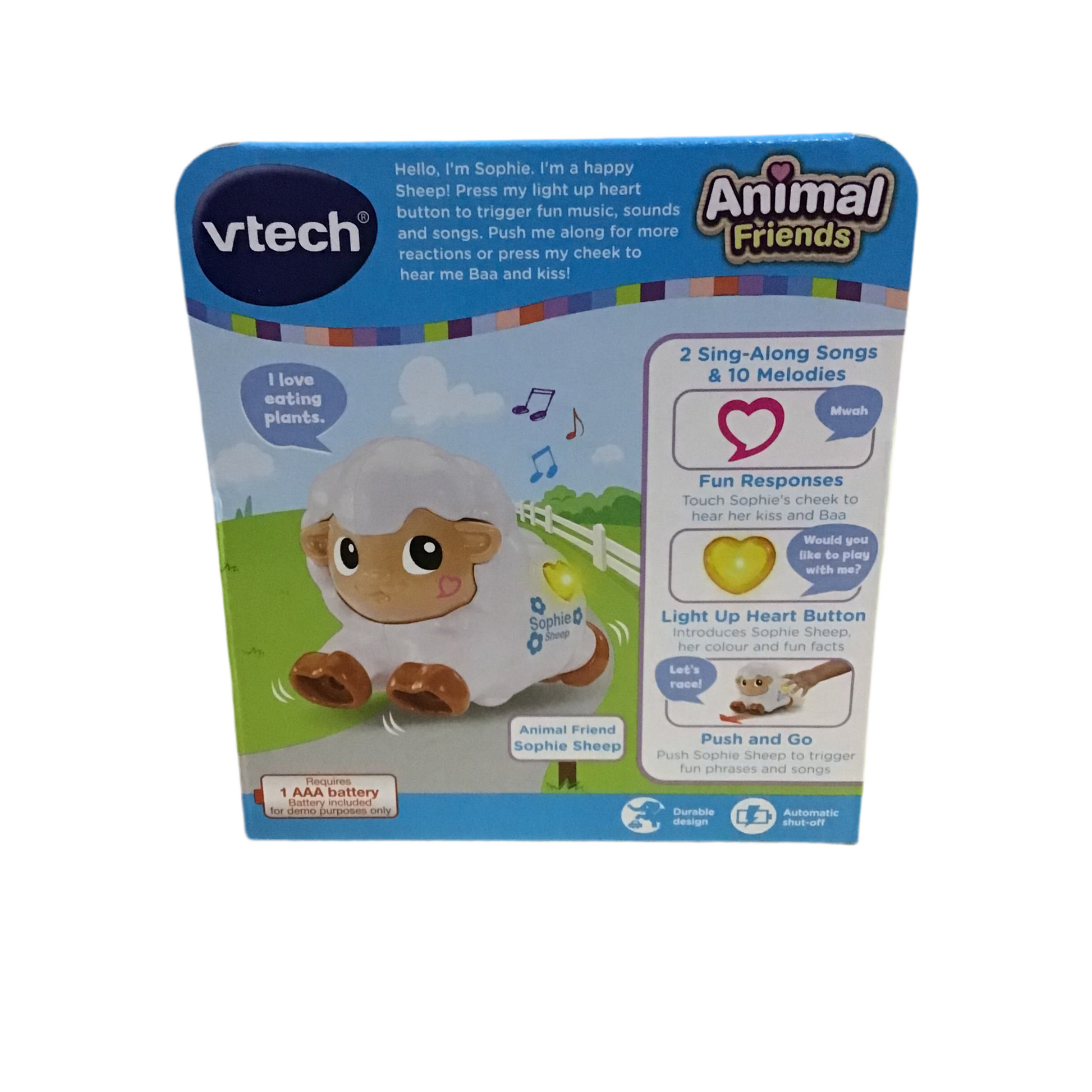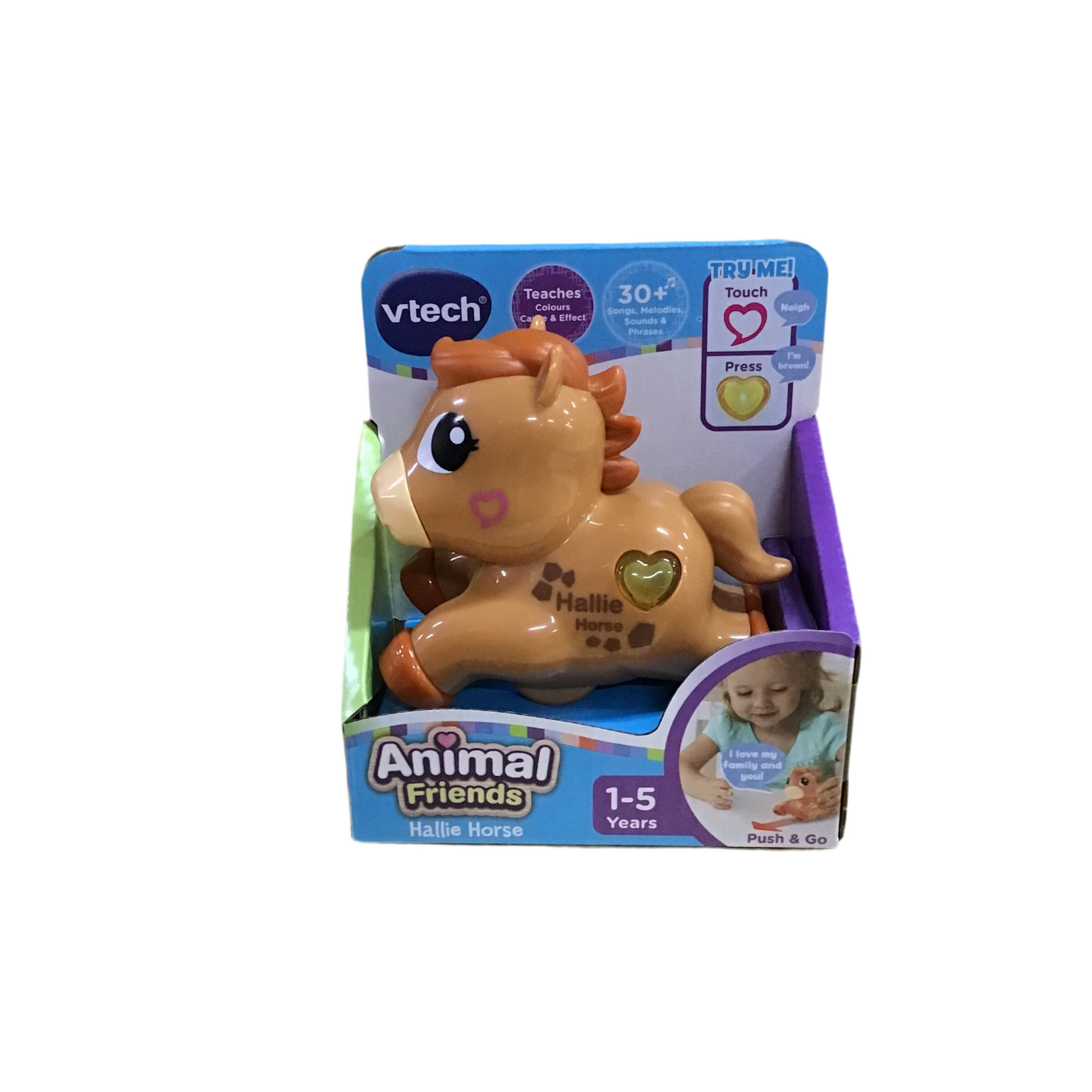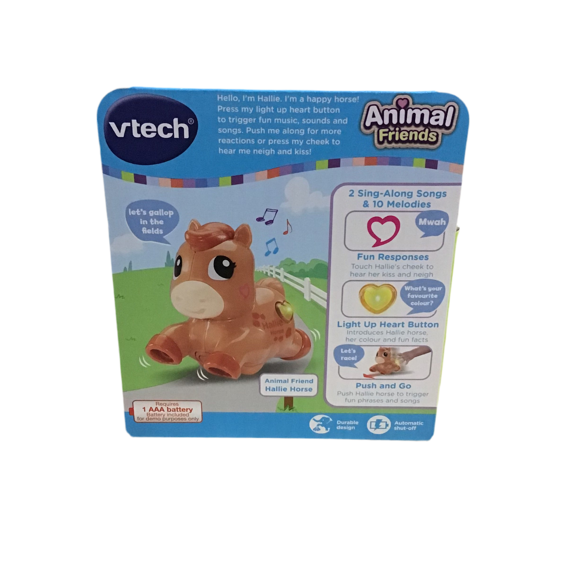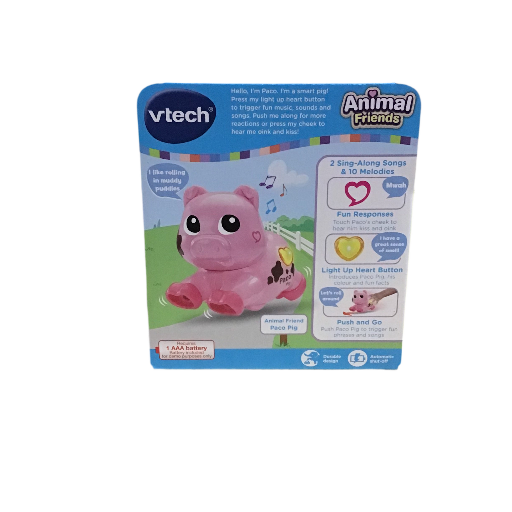 Introducing Vtech animal friends push and go toy. Suitable for kids ages 1 - 5 years, there are 6 different animals to collect, including Hallie the Horse, Clara the Cow, Sophie the Sheep, Dylan the Dog , Cleo the Cat and Paco the Pig. Each coming with 2 sing along songs and 10 melodies and even a light up heart button. Requires 1 AAA battery (not included)