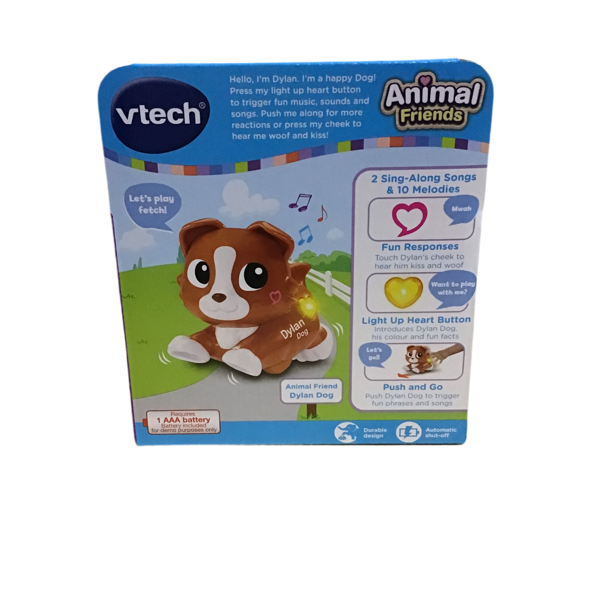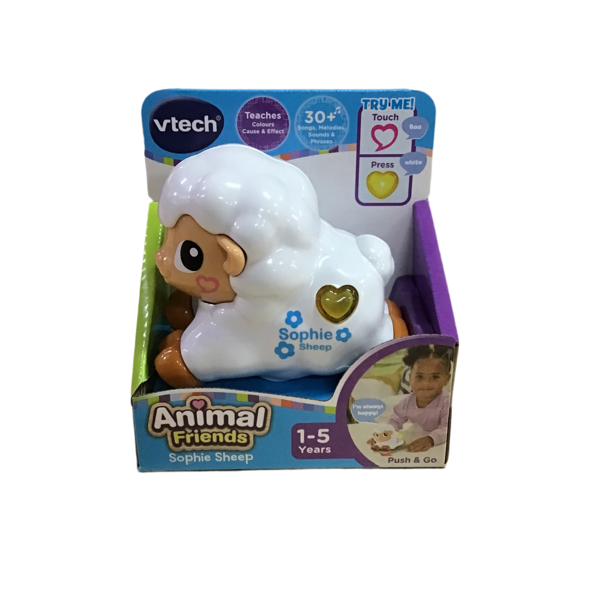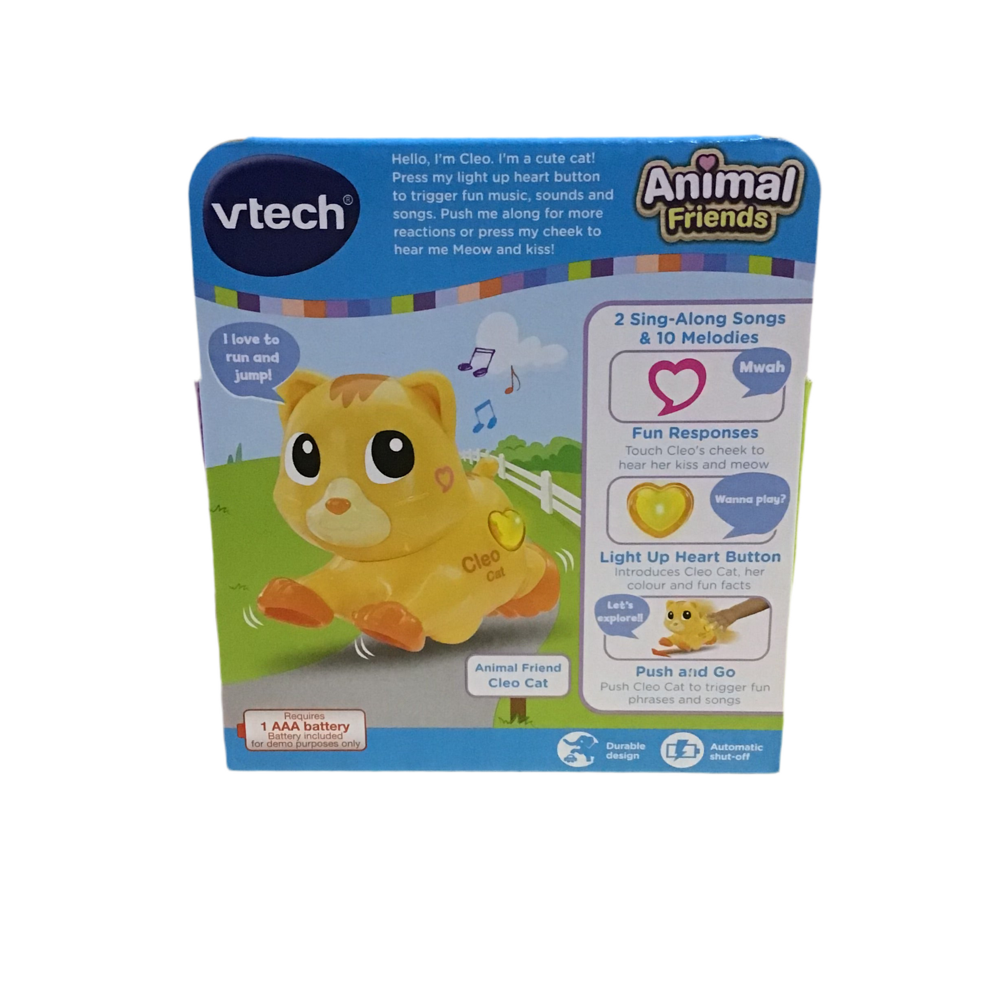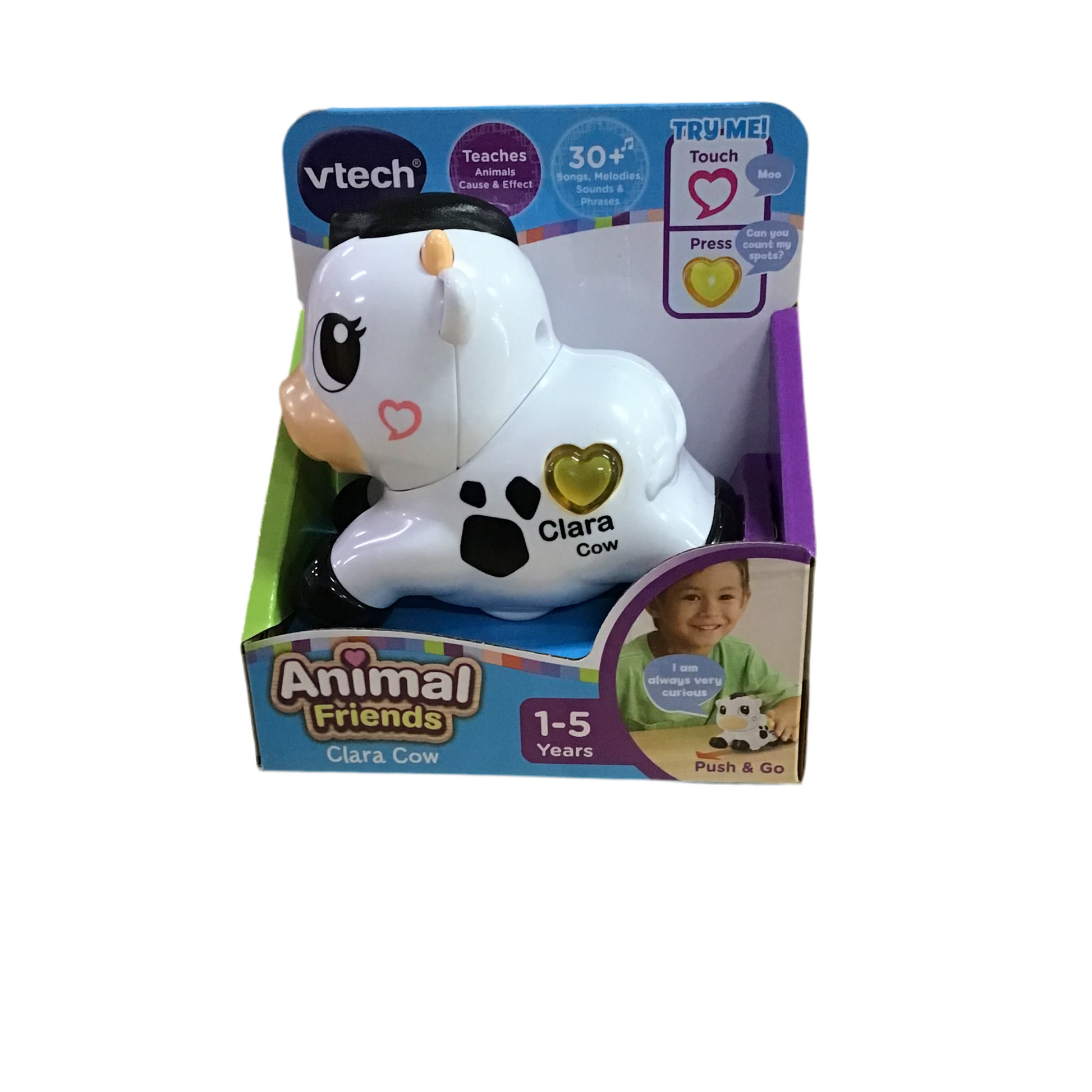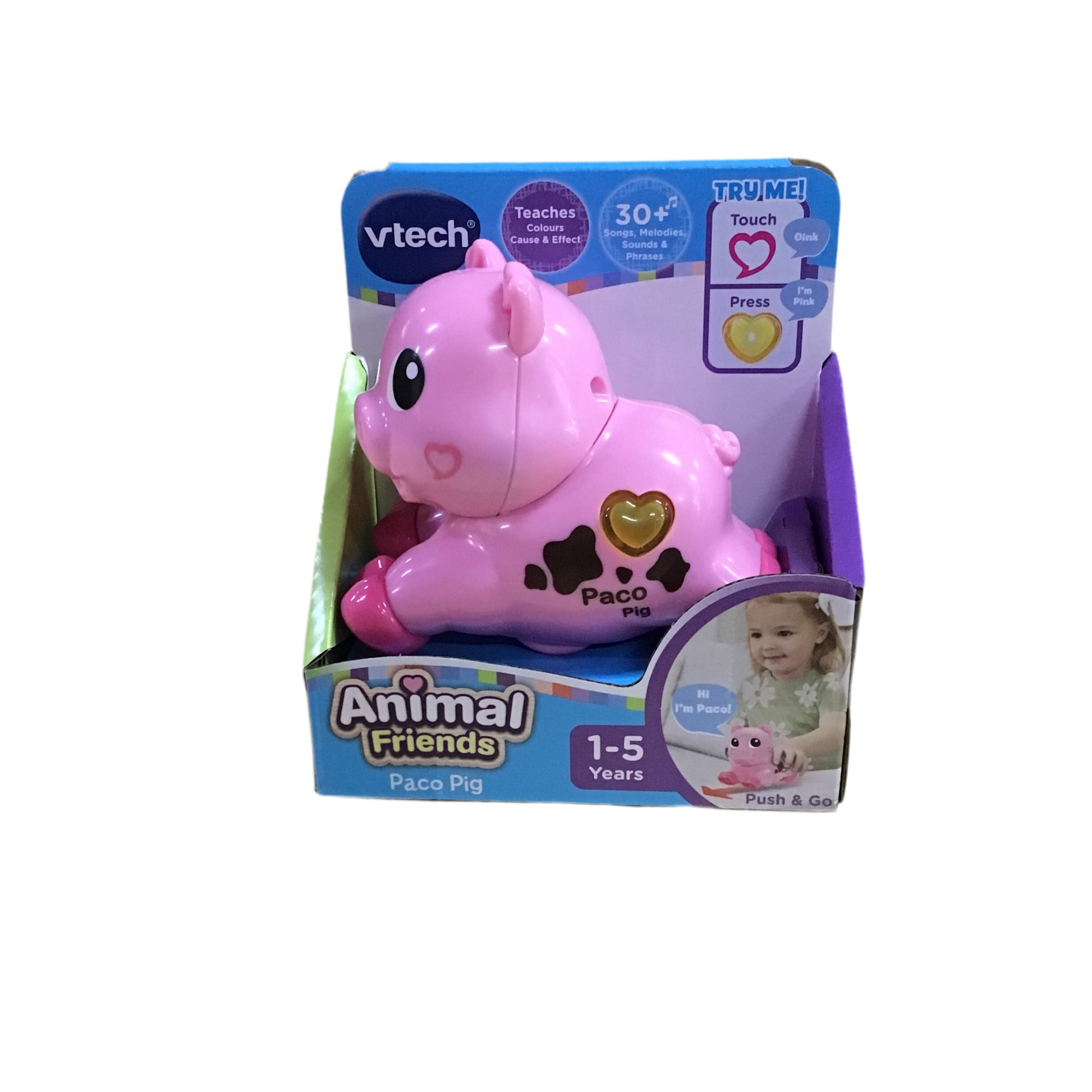 Introducing Vtech animal friends push and go toy. Suitable for kids ages 1 - 5 years, there are 6 different animals to collect, including Hallie the Horse, Clara the Cow, Sophie the Sheep, Dylan the Dog , Cleo the Cat and Paco the Pig. Each coming with 2 sing along songs and 10 melodies and even a light up heart button. Requires 1 AAA battery (not included)
