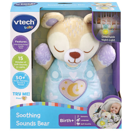 Introducing the Soothing Sounds Bear by VTech! This soft and cuddly on the go bear is great for snuggles and cuddles. Bear has two modes of play that features soothing nature sounds, songs and melodies. Bear's light up tummy gives off a gentle glow too soothe your little one. The electronic module can be easily removed and used as a nightlight and the brightness can be adjusted to provide the perfect lighting. There is a strap on the electronic module that allows you to hang it near baby's bed or it can stand up on a side unit. When the electronic module is removed, Bear is machine washable. Includes 32 soothing melodies and 4 calming songs.