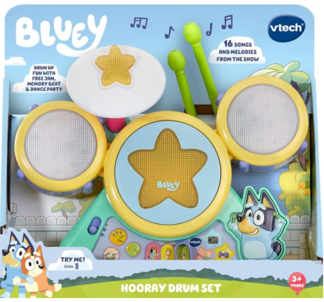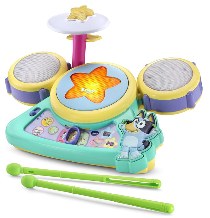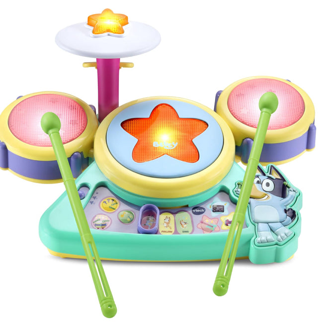 Put on a show with Bluey and drum along to catchy electronic, country and pop melodies; see the drum pads and cymbal light up