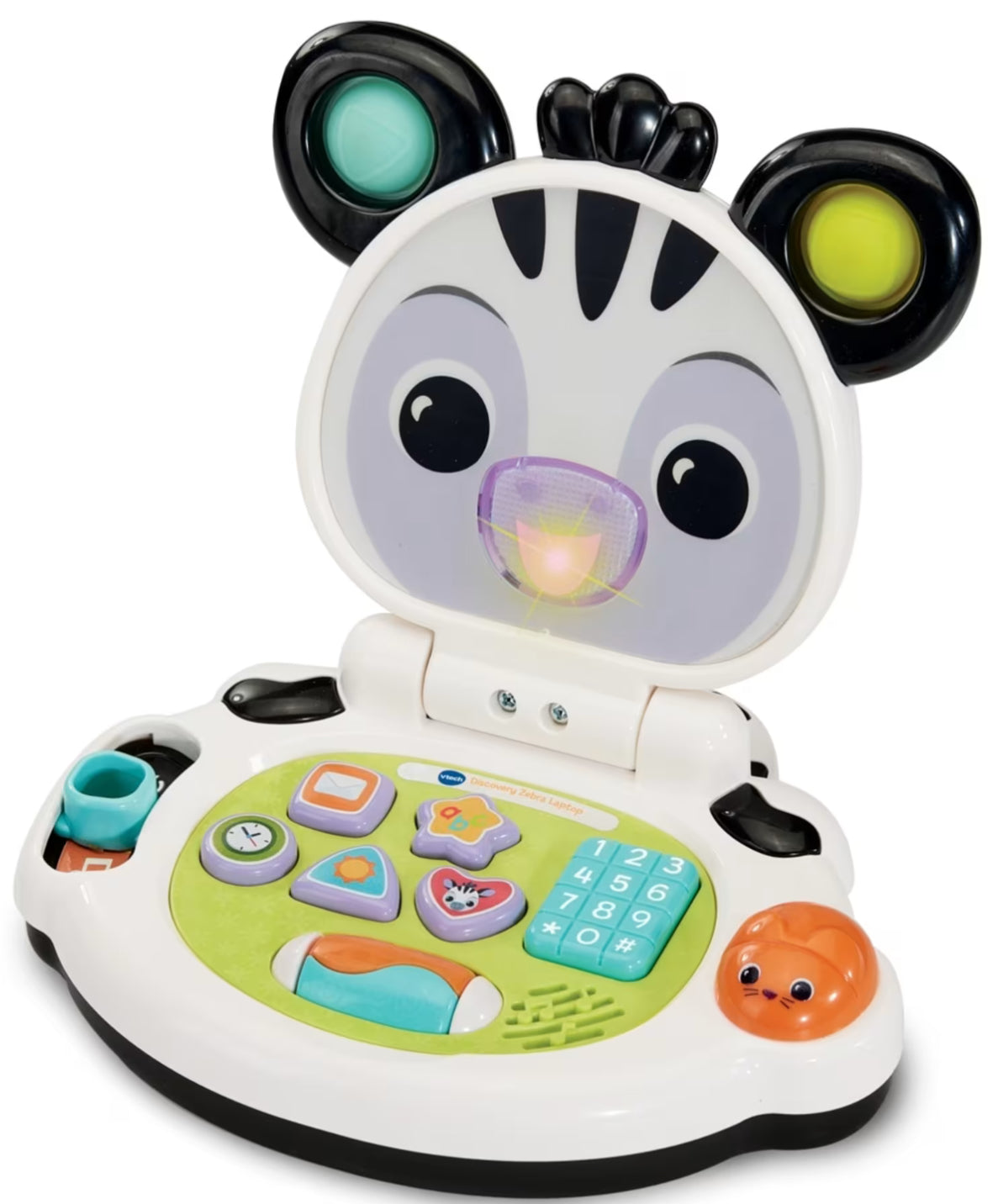 Get to work playing! The Discovery Zebra Laptop from VTech is black, white and fun all over! Buttons introduce shapes, letters and numbers while the roller, mouse and poppers give little fingers a workout. Discover weather, messages, letters, animals and time with the five shape keys. Press the number pad to hear counting and a counting song. Spinning roller and sliding mouse help strengthen fingers and hand-eye coordination. Zebra's twinkling mouth glows with the sounds and music. Includes four sing-along songs and 12 melodies.