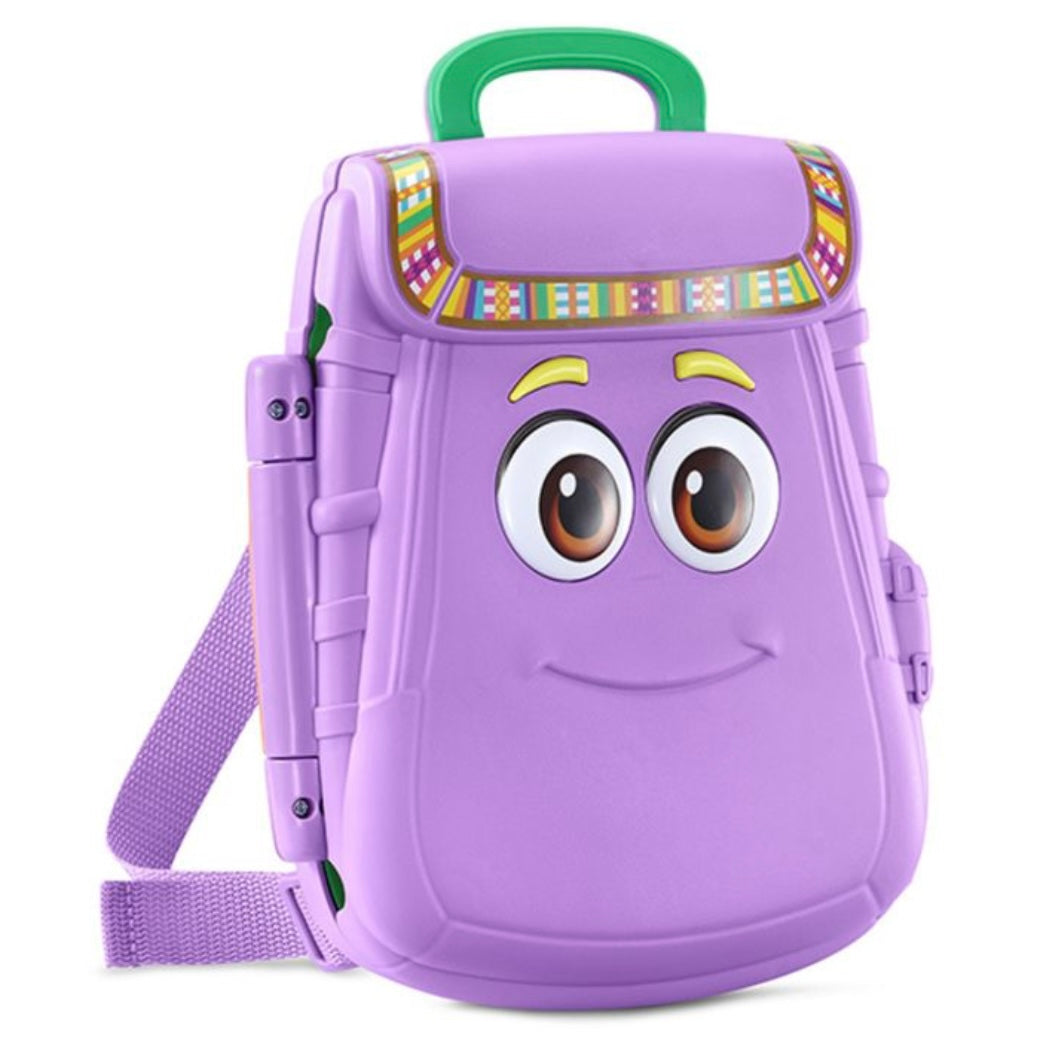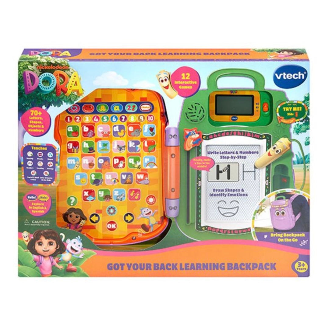 Who's got your back?! Why it's the Dora Got Your Back Learning Backpack by VTech® of course! Pack your bag and get ready to have a blast learning letters, numbers, counting, shapes, emotions, writing and more! Open Backpack to explore fun learning activities in both English and Spanish! Use the included stylus to write letters, draw shapes, and more with step-by-step animations! Clear the board with Swiper, then pack up and head out to the next adventure! Enjoy a total of 12 interactive learning games! Features a backlit LCD screen which helps brighten up playtime. Personalise the Backpack with your child's name and hear greetings from Dora's friends!